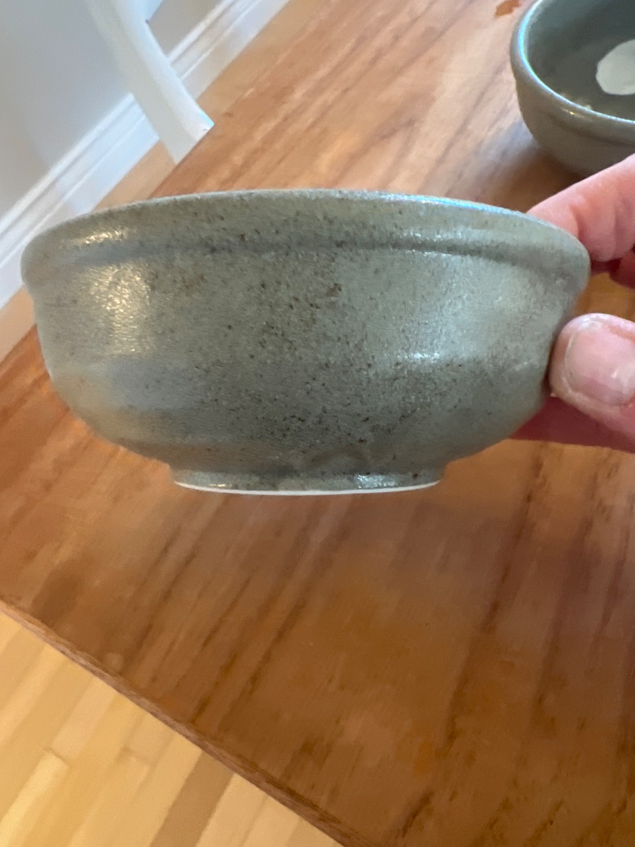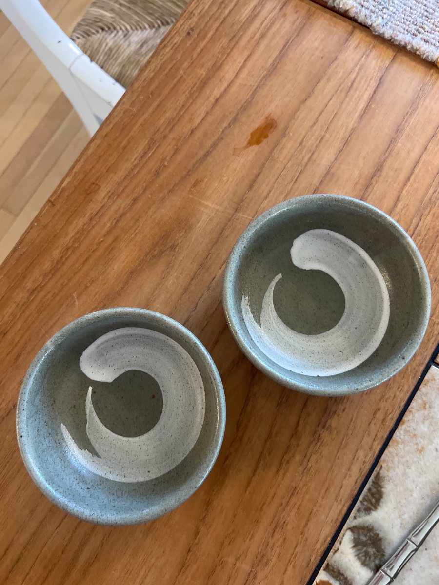 These are wheel-thrown stoneware bowls featuring a 'hakeme' style brushstroke that forms an Enso, the Zen symbol of absolute enlightenment and the universe.