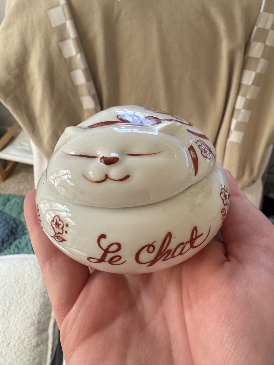 This charming porcelain 'Le Chat' (The Cat) box is a classic example of late 20th-century boutique giftware, featuring a serene sleeping feline form.
