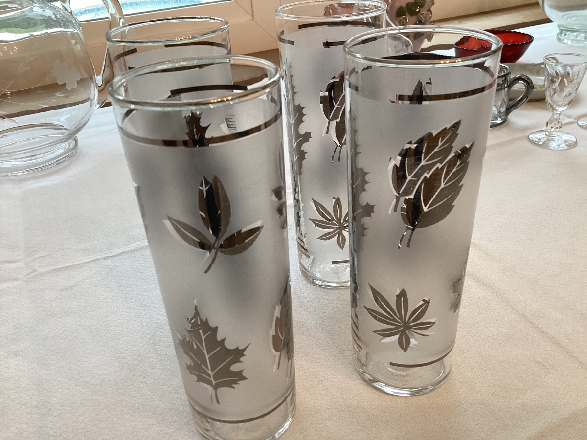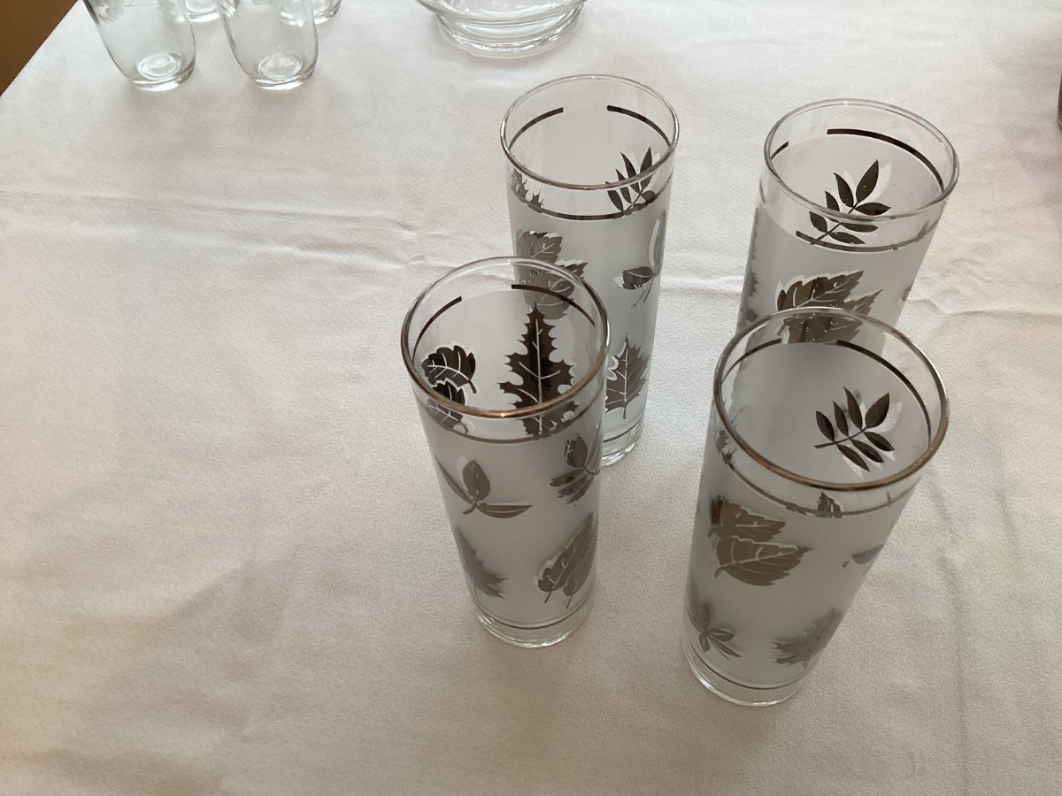 The frosting appears even, and the silver leaf patterns retain much of their luster, though there is slight thinning visible on some of the top bands. This estimate is for a set of four in good condition; individual glasses typically sell for $10-$15, while complete sets of eight with the original brass carrier can…