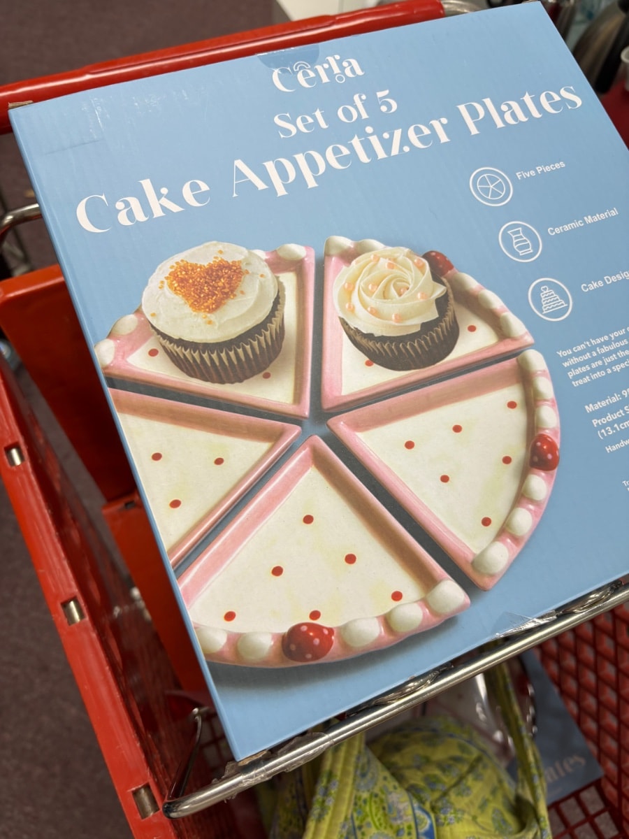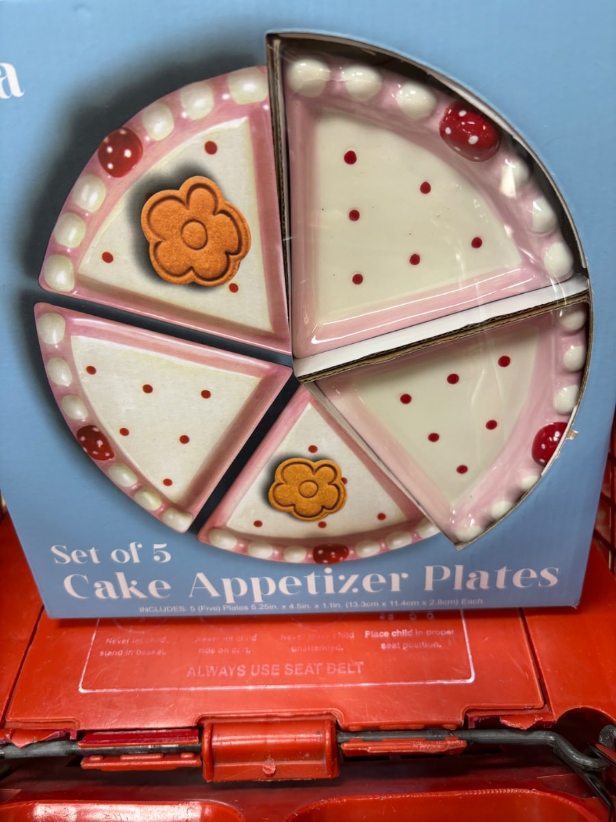A whimsical set of five ceramic appetizer plates designed to resemble individual slices of a frosted cake. When arranged together, they form a circular 'cake' complete with painted ladybug accents and scalloped frosting edges.