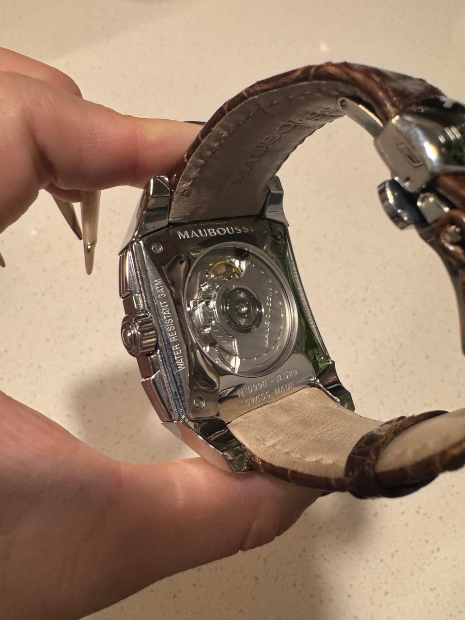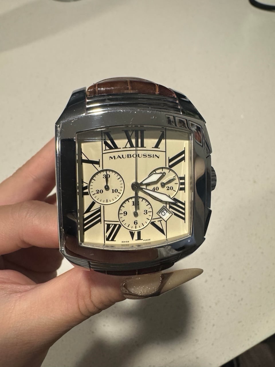 The case shows light surface scratches (swirlies) consistent with regular wear, particularly on the high-polish bezel. Value is driven by the prestige of the Mauboussin name and the mechanical automatic movement.