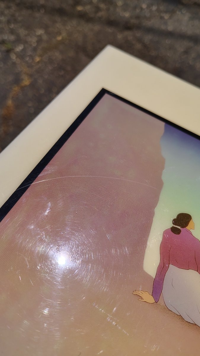 The second photo reveals significant circular surface scratches and 'swirl marks' on the glossy finish, likely from improper cleaning or storage. Quick ID could not verify a named-artist market here, so this is intentionally priced like decorative/local-sale art.