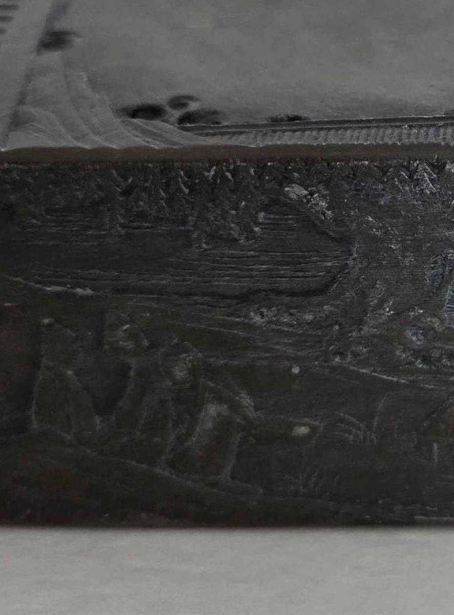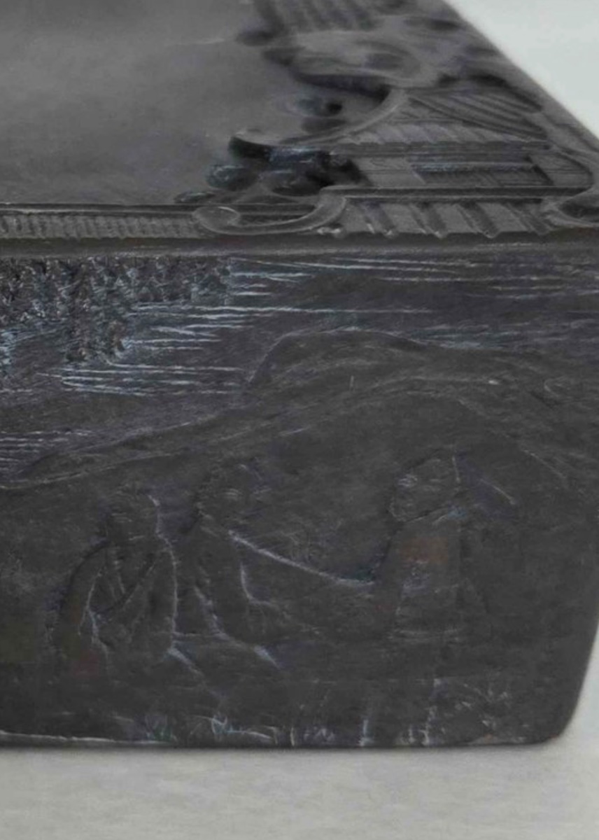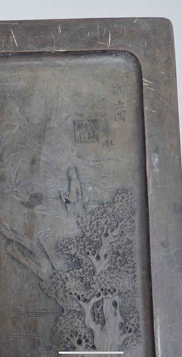 A sophisticated 'scholar's object' used for grinding solid ink sticks into liquid, featuring intricate relief carvings of a mountain landscape.