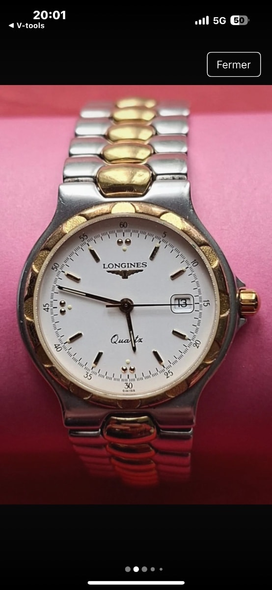 The watch shows honest wear consistent with daily use, specifically some thinning of the gold plating on the high points of the bezel and bracelet links. Values for these neo-vintage quartz models are driven by the condition of the gold plating and the integrity of the integrated bracelet.