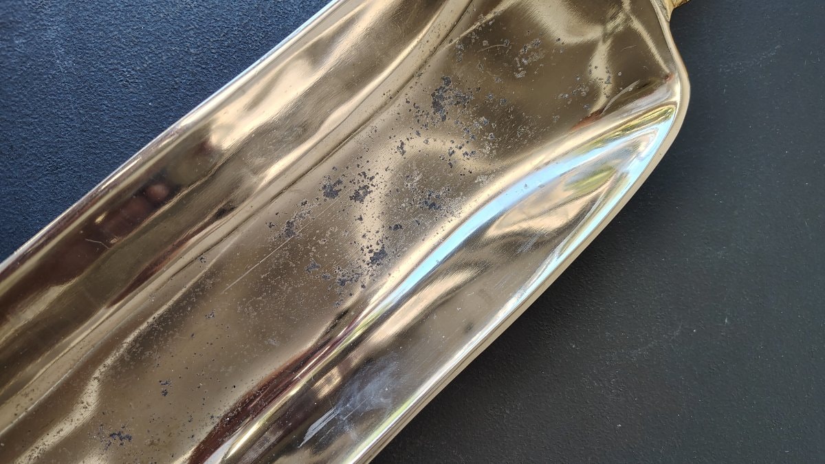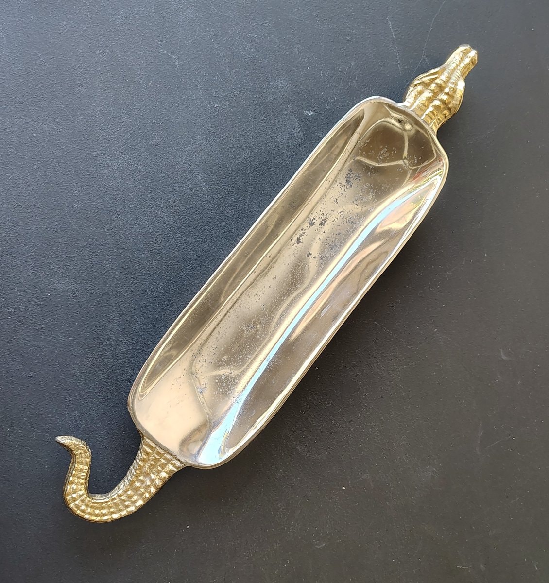 The tray shows significant pitting and oxidation to the gold-tone finish in the center of the basin, likely caused by moisture or contact with acidic items. Value is driven by the popular alligator motif and functional size, though the visible pitting in the finish keeps it in the decorative/thrift range rather than the…