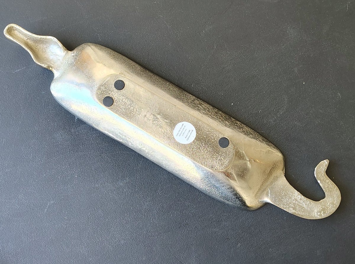 A whimsical and elongated 'catch-all' tray featuring a stylized alligator with a textured head and a playfully curled tail.