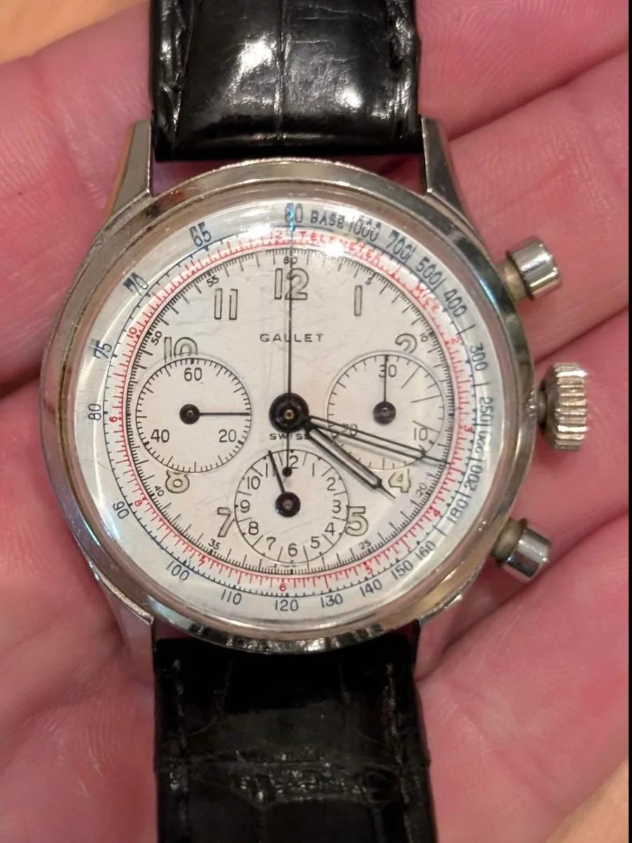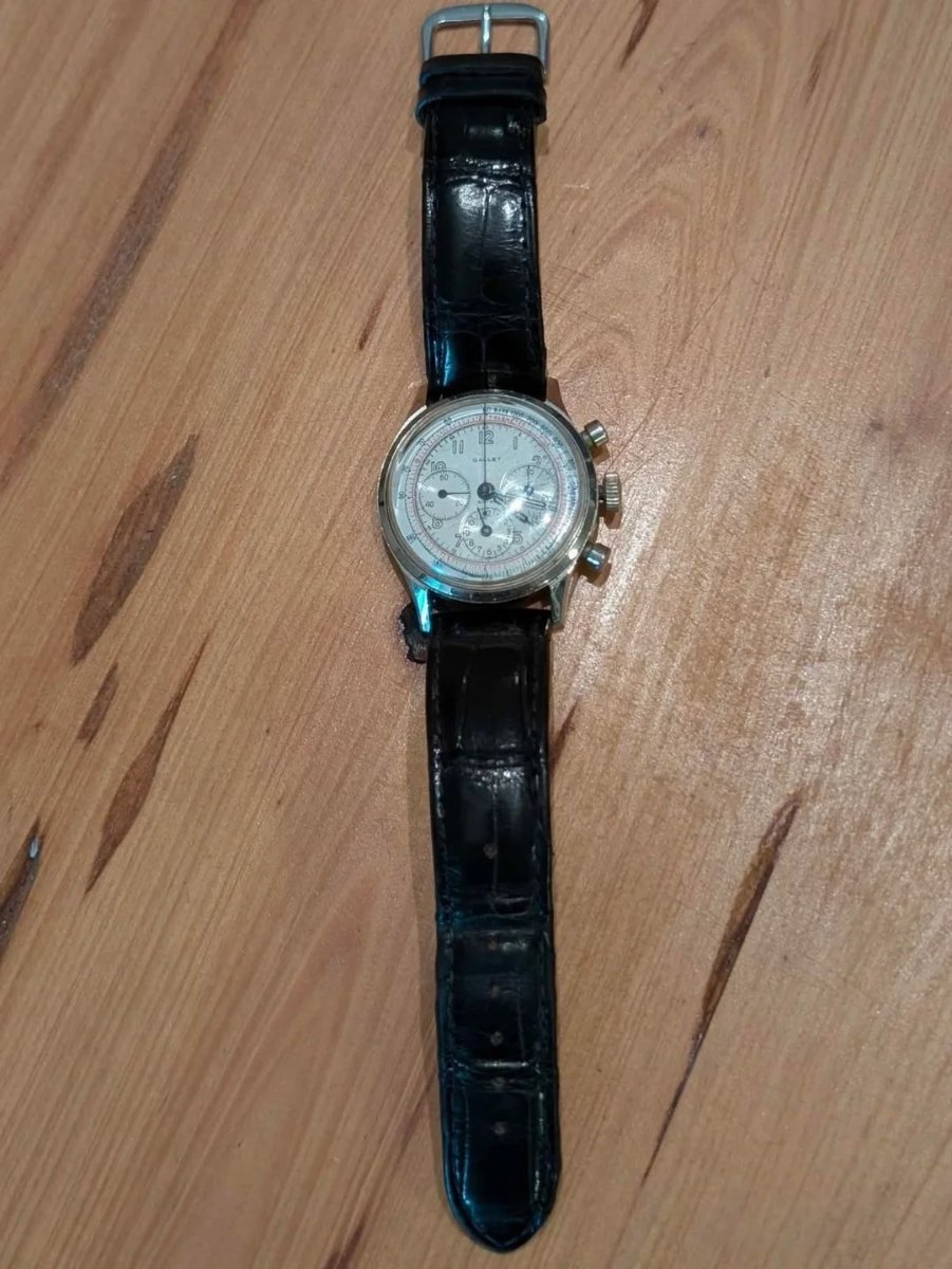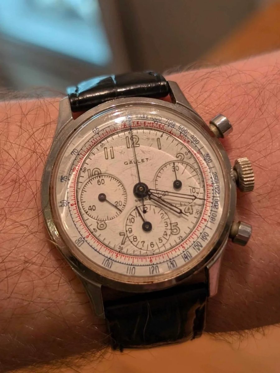 The dial shows an honest, light patina and minor spotting consistent with its 75-year history, which collectors generally prefer over a 'restored' or reprinted dial. Gallet chronographs have seen a significant rise in value among vintage watch enthusiasts.