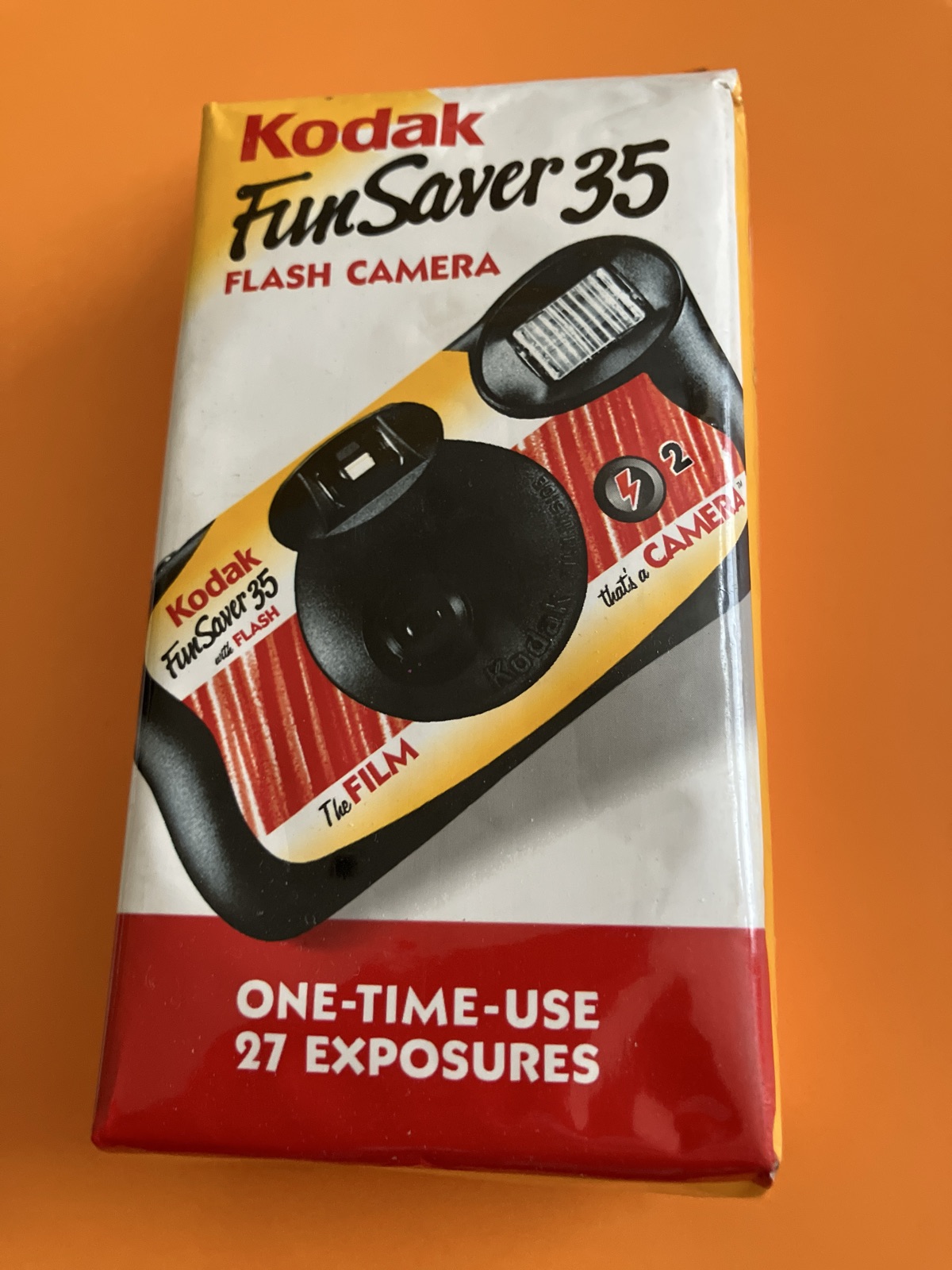 This is an original, unopened Kodak FunSaver 35, the device that democratized photography for the casual traveler and party-goer.