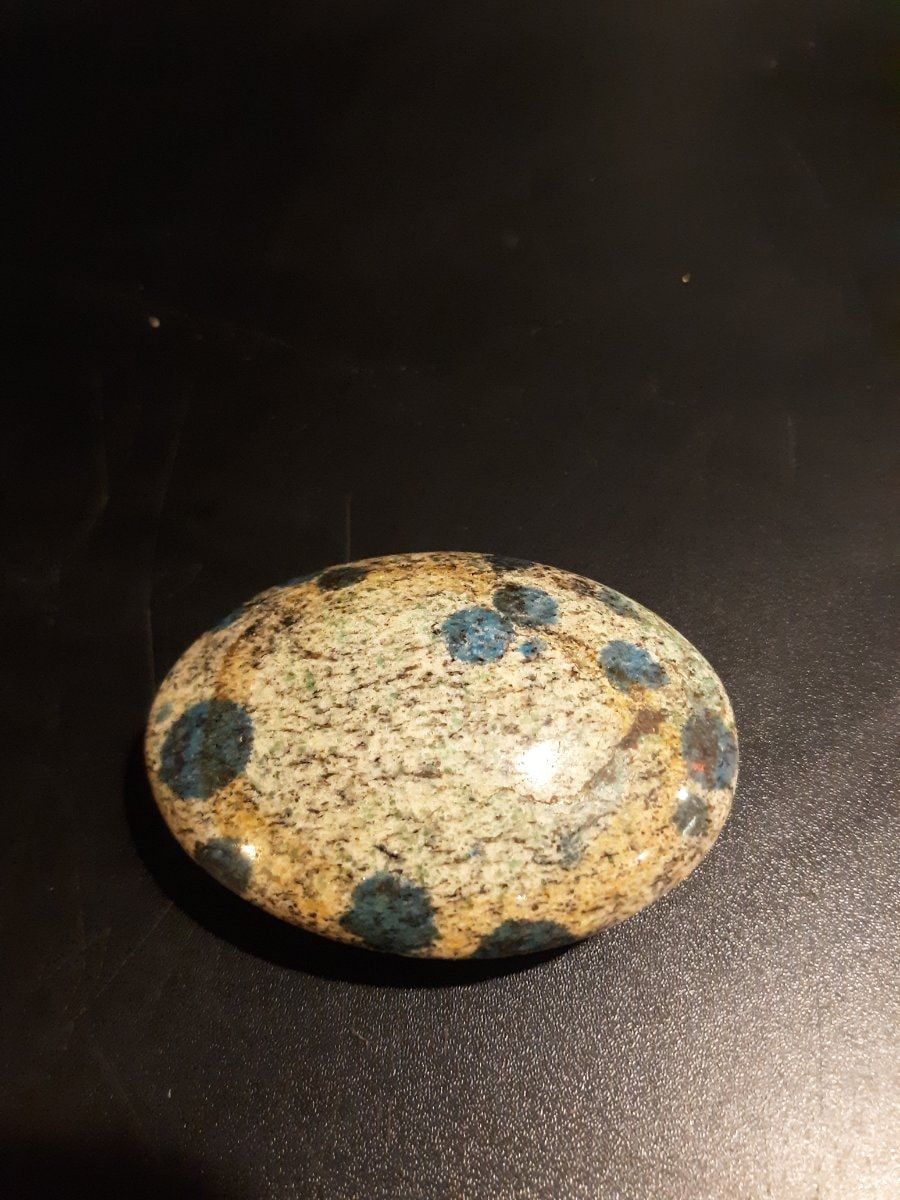 The stone appears well-polished with a smooth surface and no visible cracks or 'vugs' (natural pits). The distribution of azurite is attractive and centered. Excellent condition for a display or palm stone. Value for K2 granite is driven by the size of the specimen and the intensity/density of the blue azurite spots.