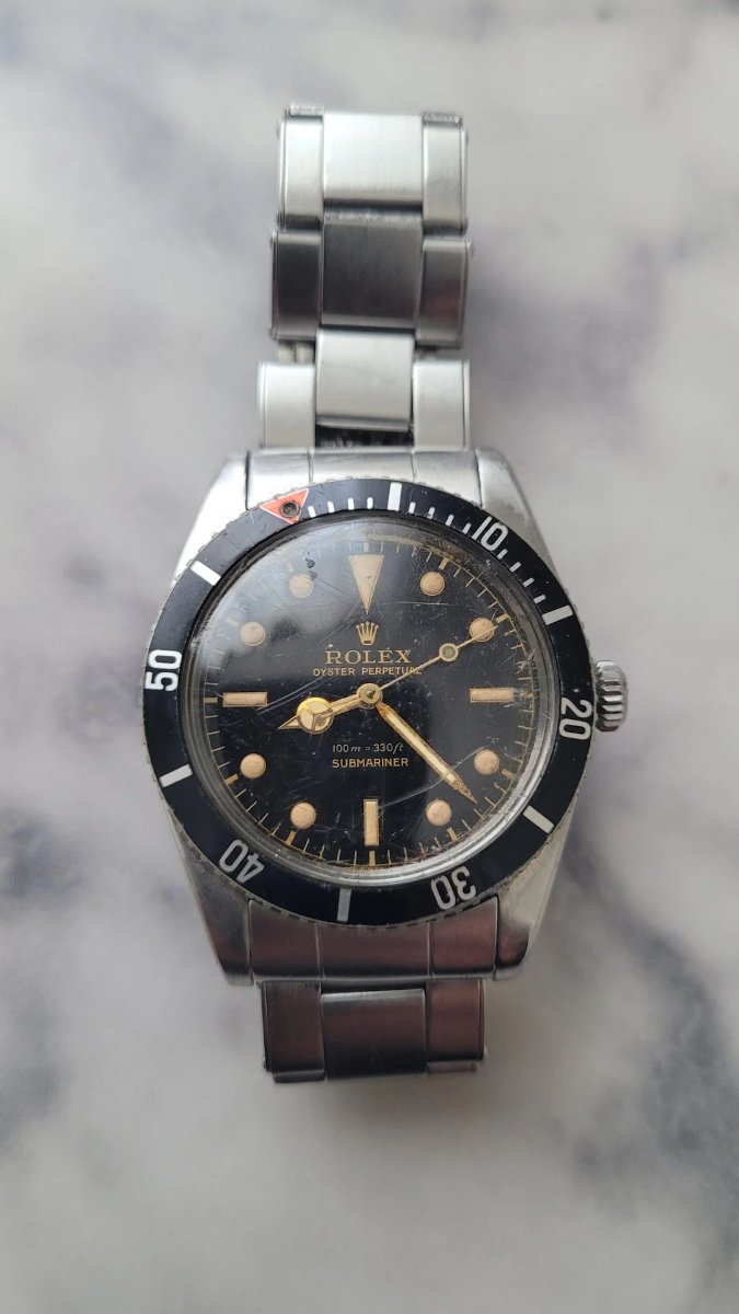 The crystal is heavily scratched, which is actually a good sign as it often means the dial underneath has been protected from UV light and moisture. Value in the vintage Rolex market is driven by 'originality' and 'patina.' The presence of the red-triangle bezel insert and a gilt dial can push prices significantly…