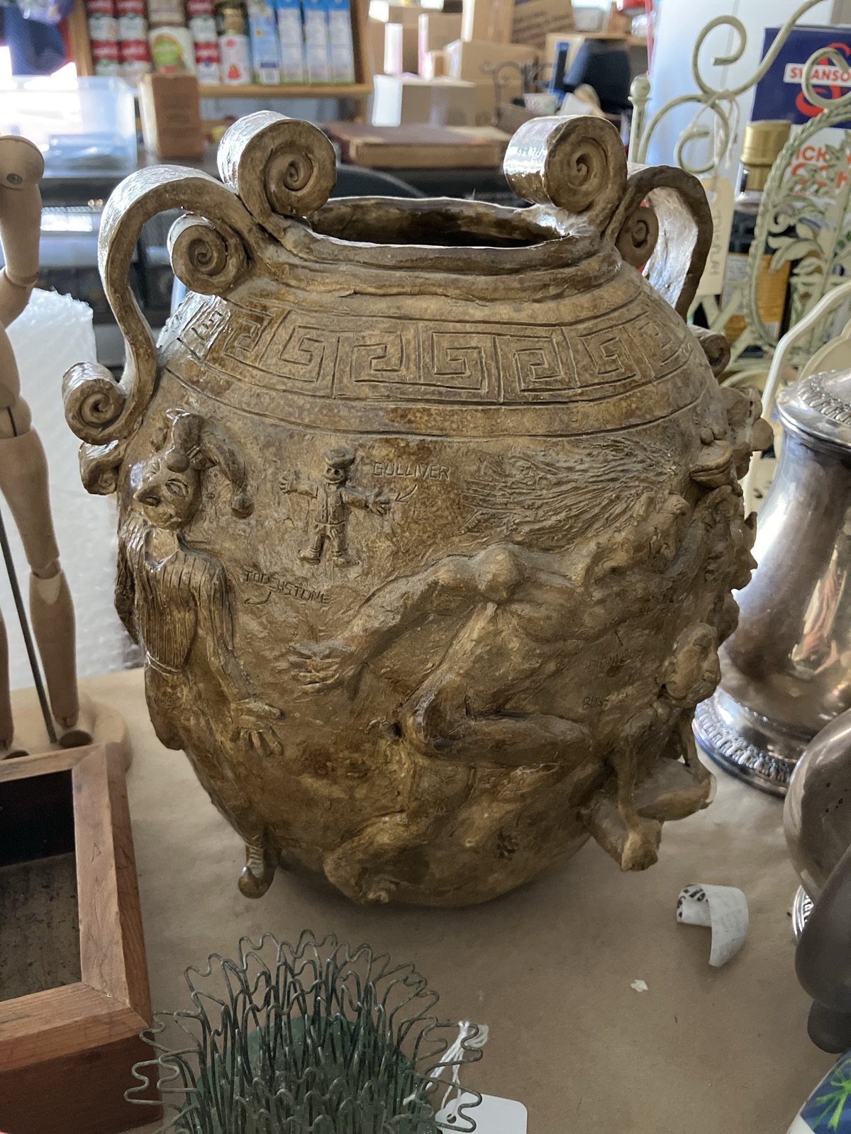A monumental hand-built ceramic vessel featuring high-relief 'sprigged' figures from literature and mythology, including Gulliver and Dionysus.