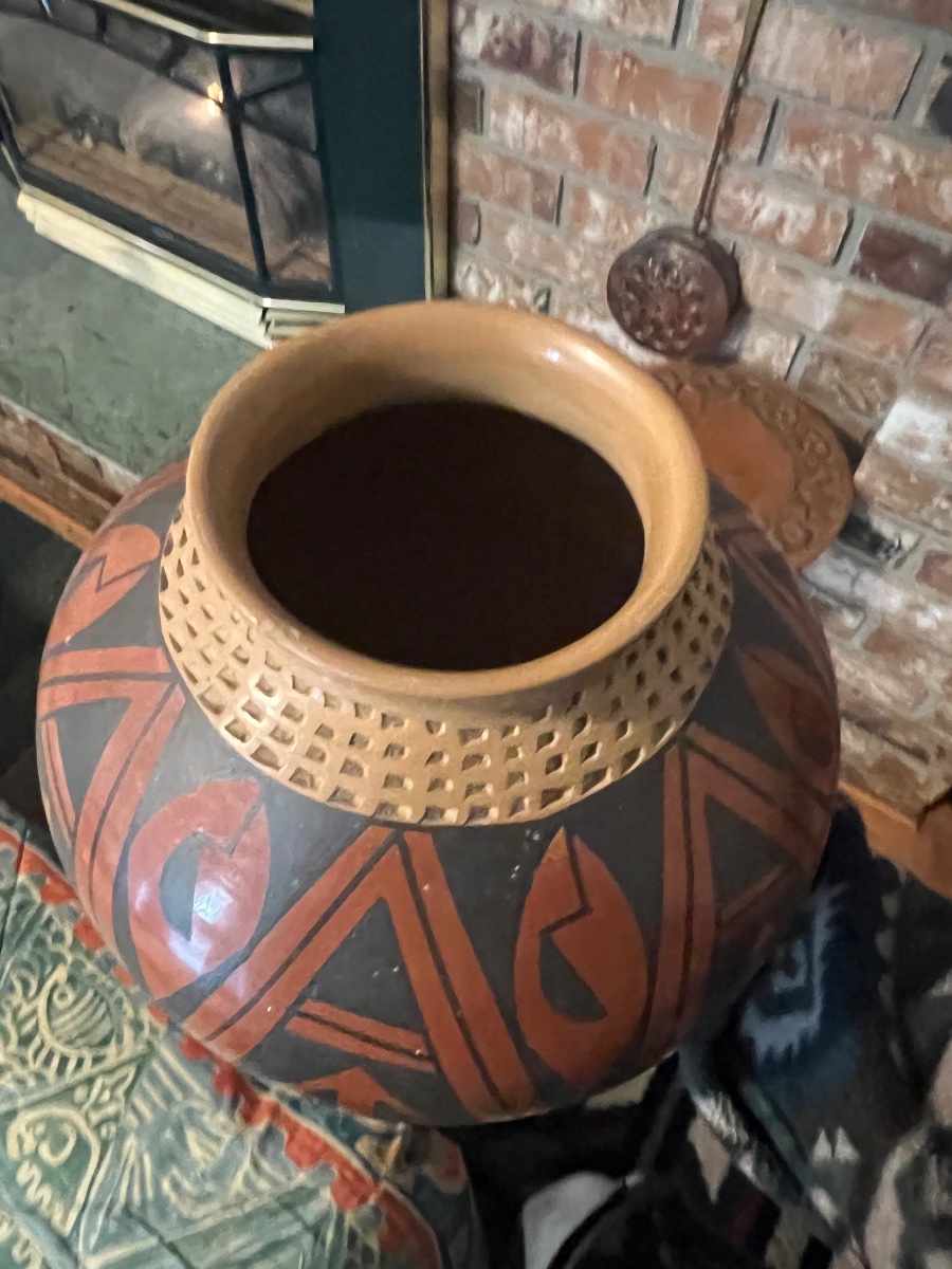 A large, hand-coiled ceramic vessel featuring bold geometric slip-painted motifs and a distinctive incised 'waffle' texture at the neck.