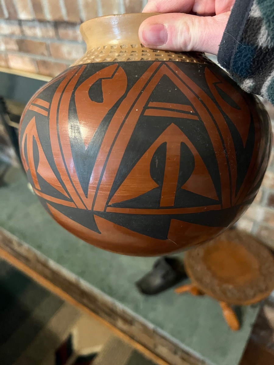 The vessel appears to be in very good condition with no visible cracks or major chips. Value is driven by the impressive scale of the vessel, the presence of a clear signature, and the quality of the geometric painting.