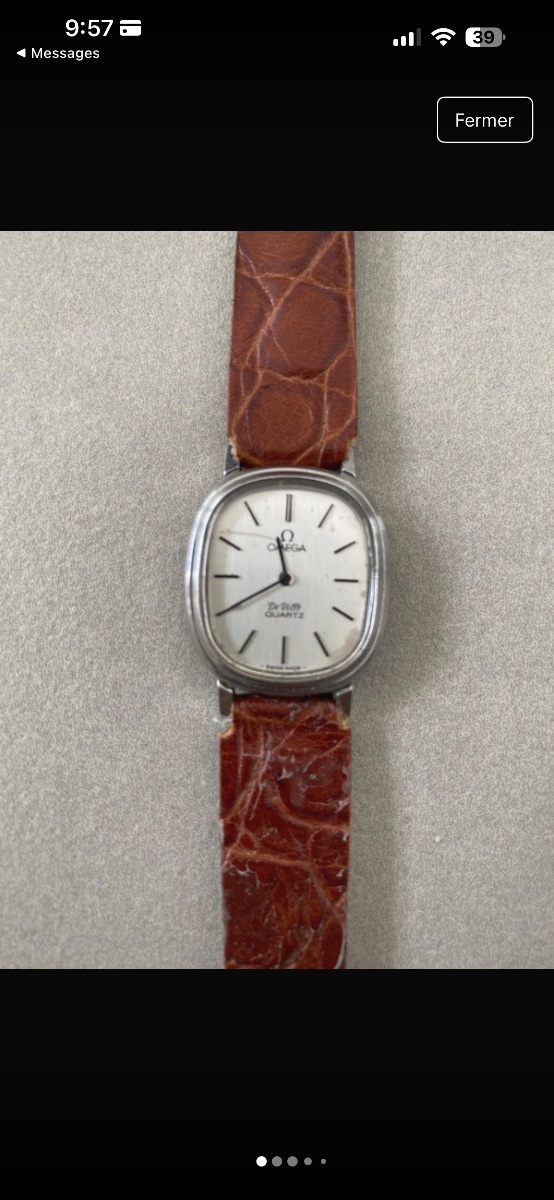 The crystal shows significant scratching and the dial appears to have some moisture spotting or 'foxing' around the edges, particularly near the 4 and 5 o'clock positions. While Omega is a top-tier brand, vintage quartz models are currently more affordable than their mechanical counterparts.