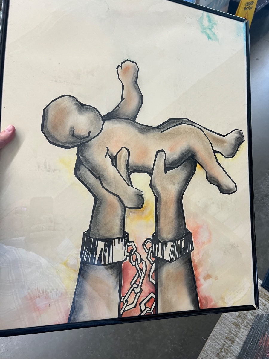 A powerful mixed-media work on paper depicting shackled hands breaking free to lift a newborn child toward the light.