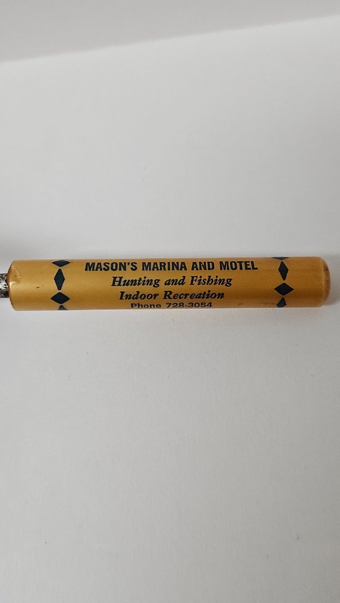 While the metal components were likely produced by a mass-market promotional firm, the true 'maker' of this piece's identity is the Mason family business.