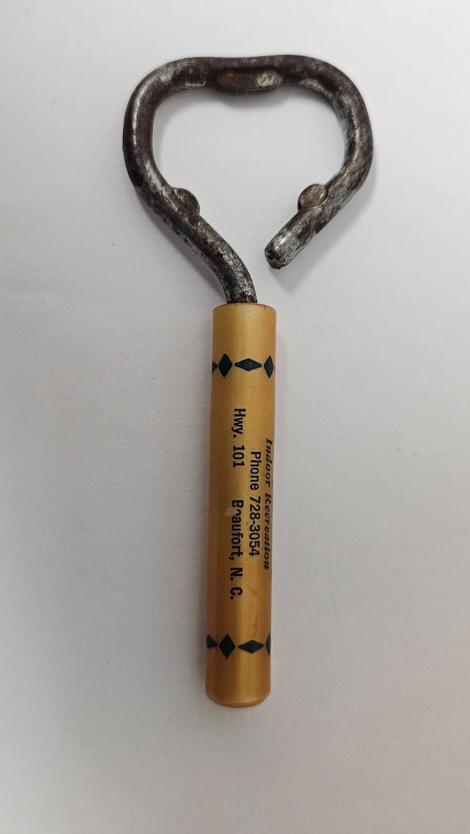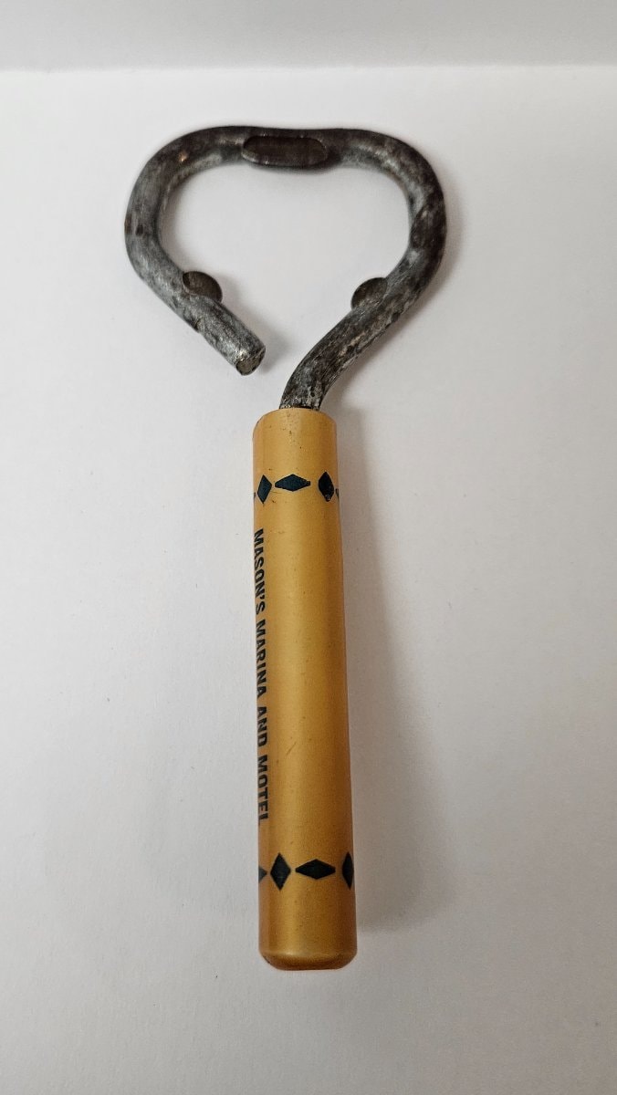 A classic mid-century promotional 'church key' bottle opener featuring a molded plastic handle and a stamped steel head.