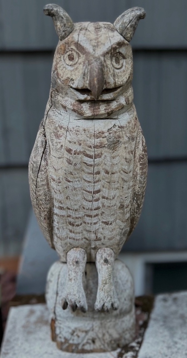 The piece shows significant weathering, heavy paint loss, and deep structural checking (cracking) consistent with long-term outdoor exposure. Folk art values are driven by 'soul' and authentic patina; while anonymous, the expressive carving and genuine outdoor weathering make it highly desirable to collectors…