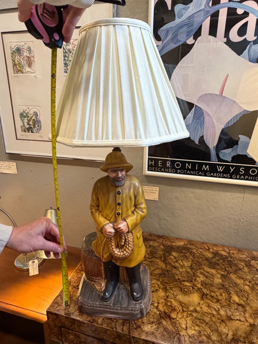 This is a classic piece of mid-century Americana, a 'novelty lamp' featuring a hand-painted fisherman in traditional yellow foul-weather gear.