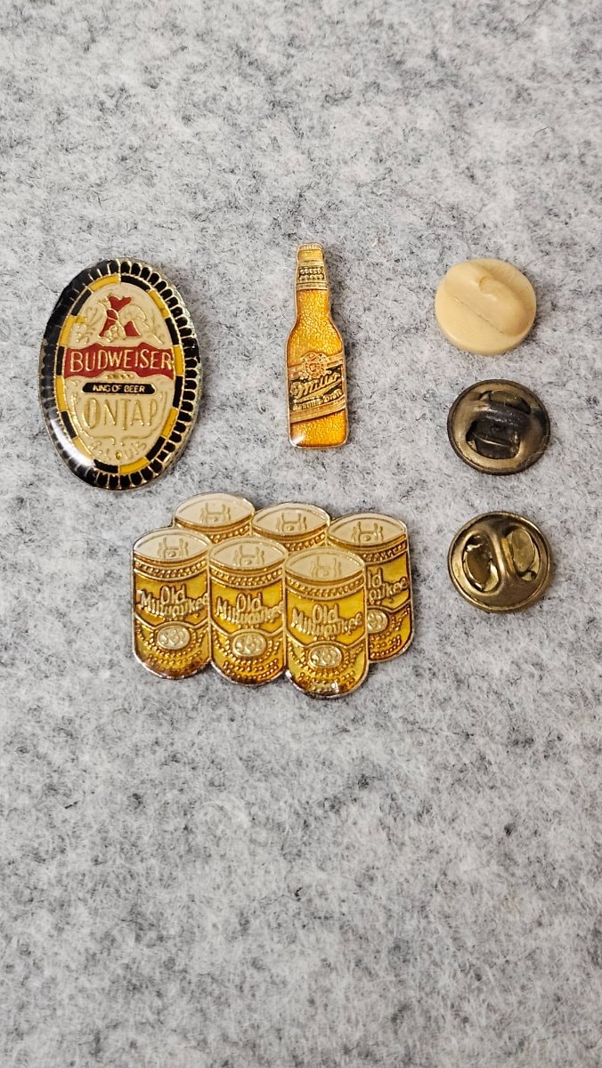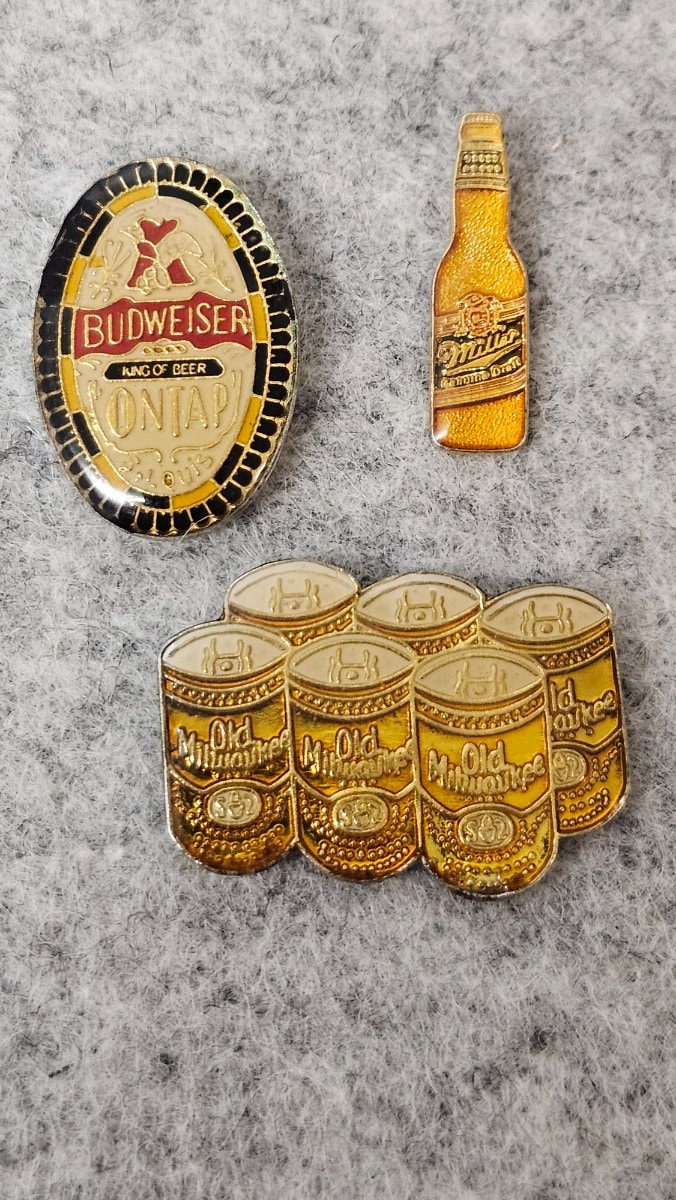 A nostalgic collection of enamel lapel pins representing iconic American beer brands: Budweiser, Miller Genuine Draft, and Old Milwaukee.