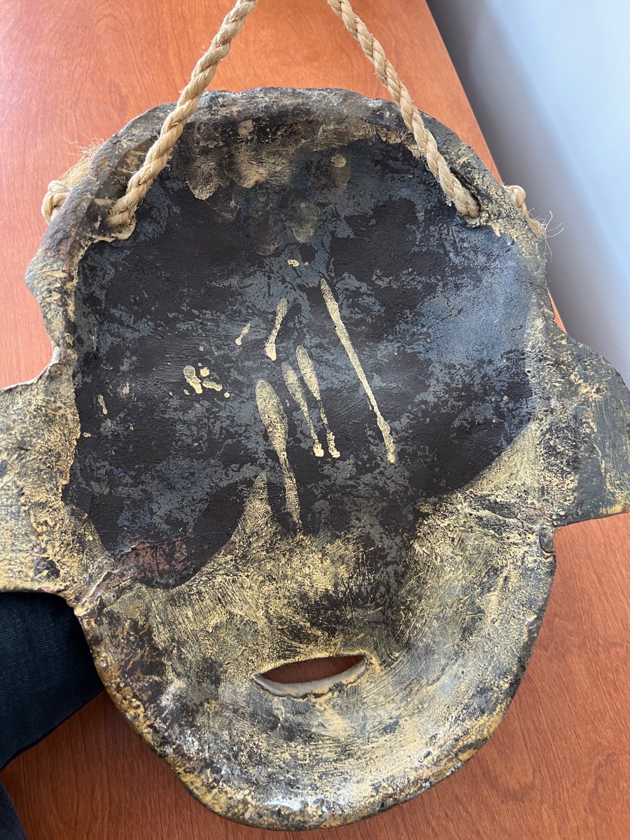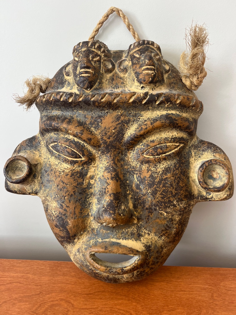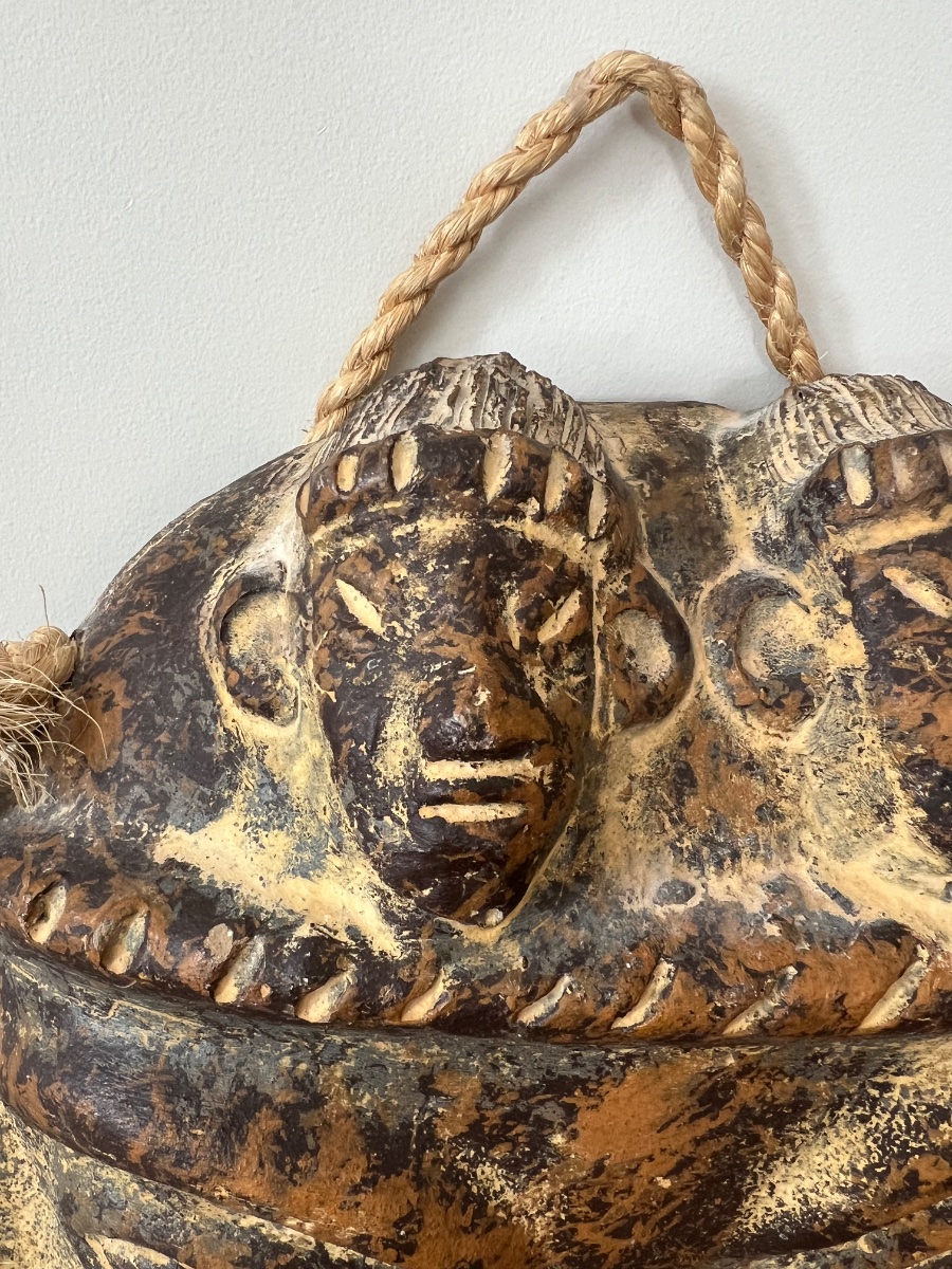 A large-scale, hand-molded clay mask featuring dual ancestor figures on the crown and prominent ear spools.