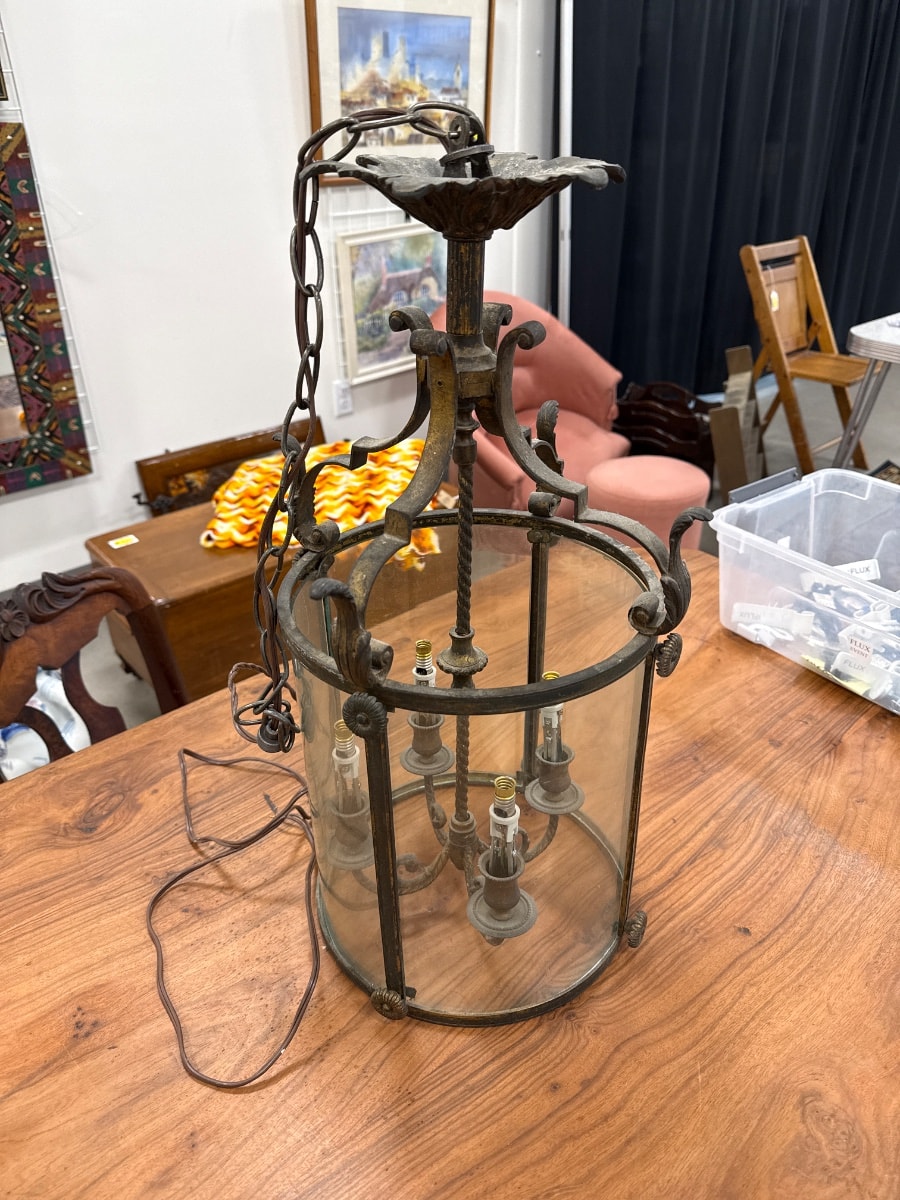 The lantern appears to be in good vintage condition with its curved glass panels intact. Value is driven by the scale of the piece and the condition of the curved glass panels, which are expensive to replace.