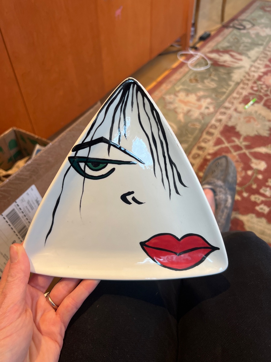 A striking triangular ceramic dish featuring a minimalist, stylized female face that captures the high-contrast 'New Wave' aesthetic.