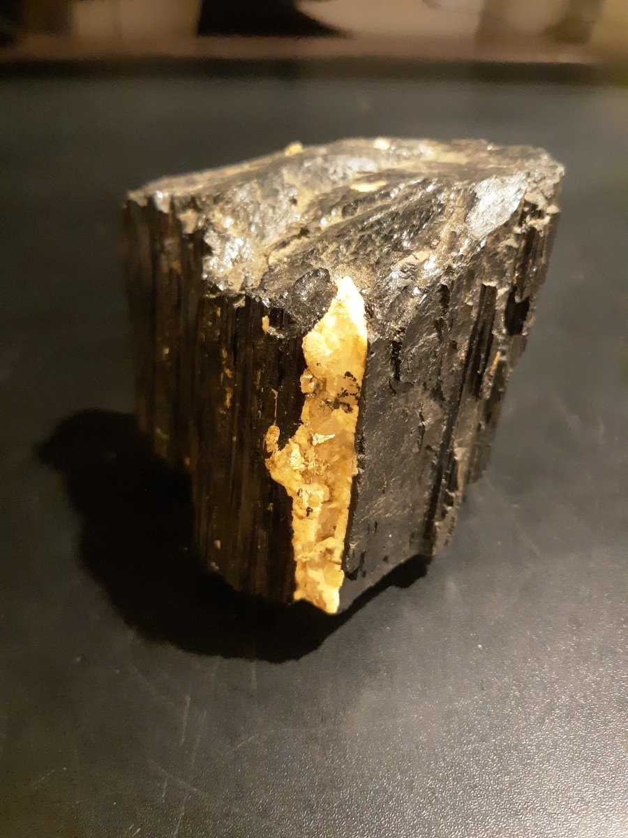 This is a raw, unpolished specimen of Black Tourmaline, scientifically known as Schorl, featuring a striking vertical vein of quartz or feldspar.