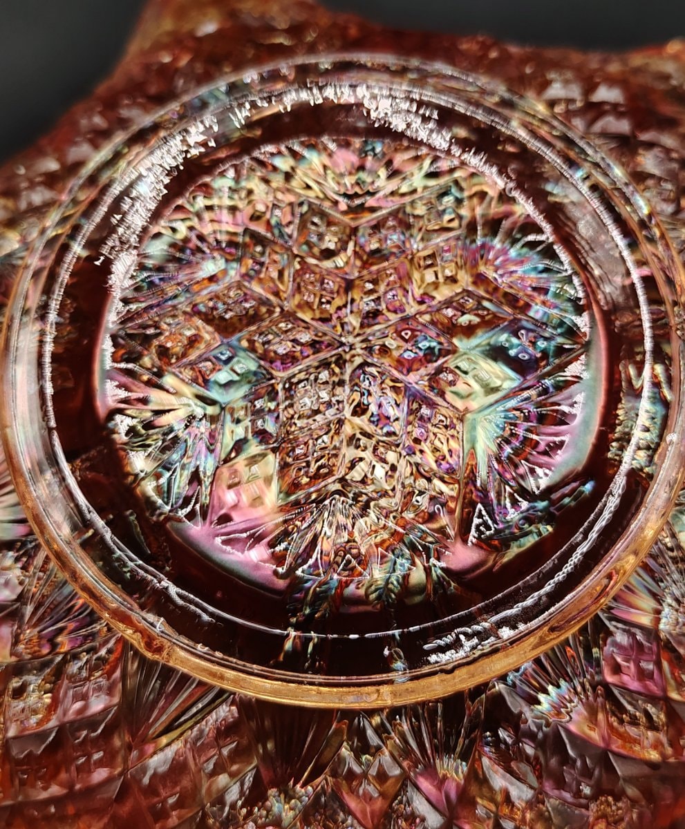 In 1908, the glass world was turned upside down when manufacturers discovered how to mimic the expensive, hand-blown iridescent glass of Tiffany and Steuben using mass-production techniques.