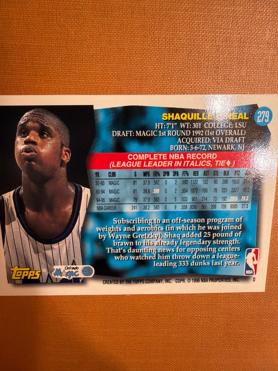 A classic mid-90s base card featuring Shaquille O'Neal during his final dominant season with the Orlando Magic.