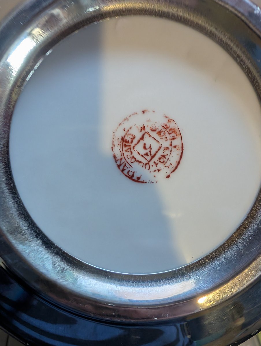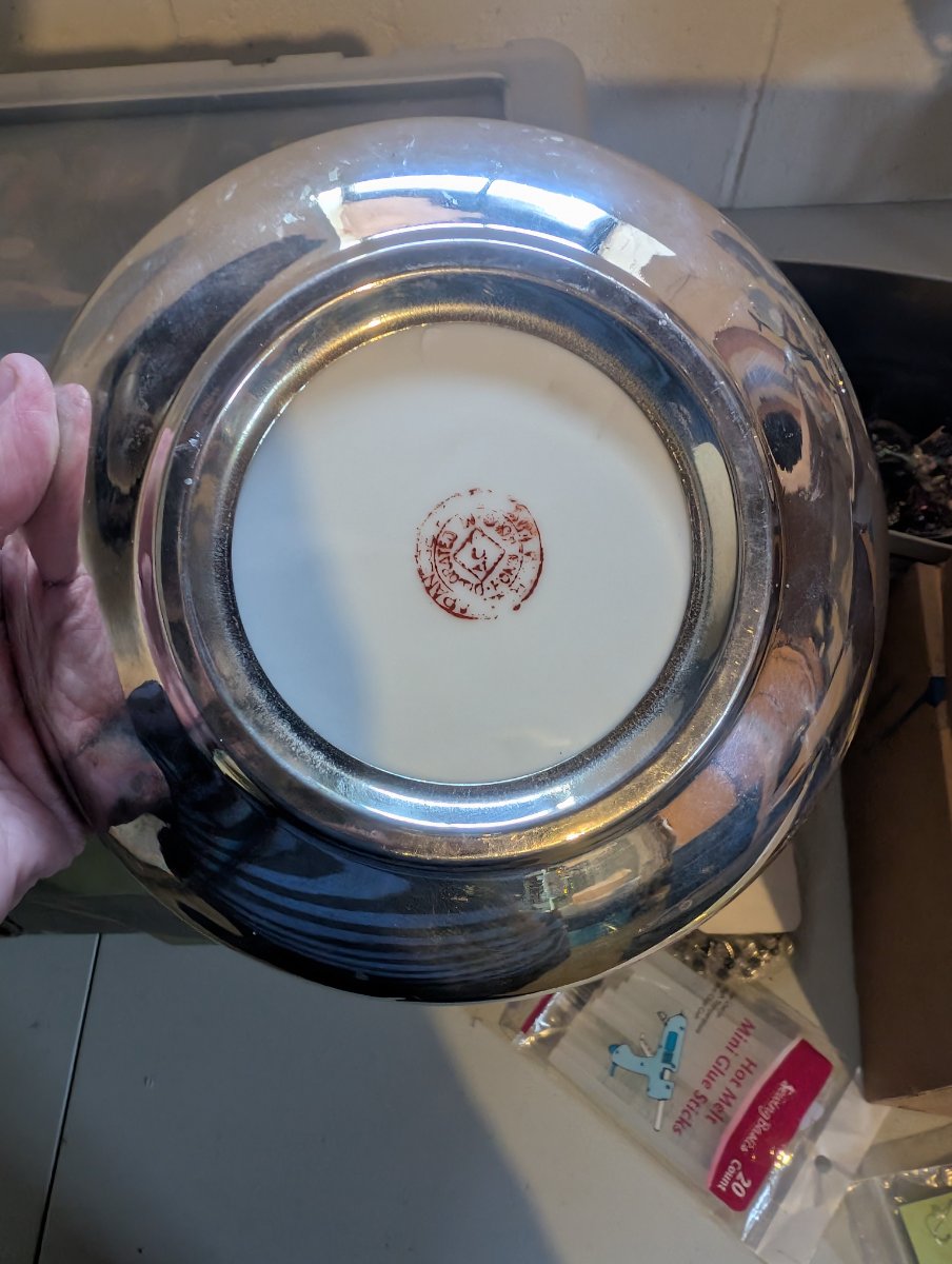 A fascinating mid-century fusion piece featuring a hand-painted porcelain interior encased in a reflective, chrome-plated metal shell.