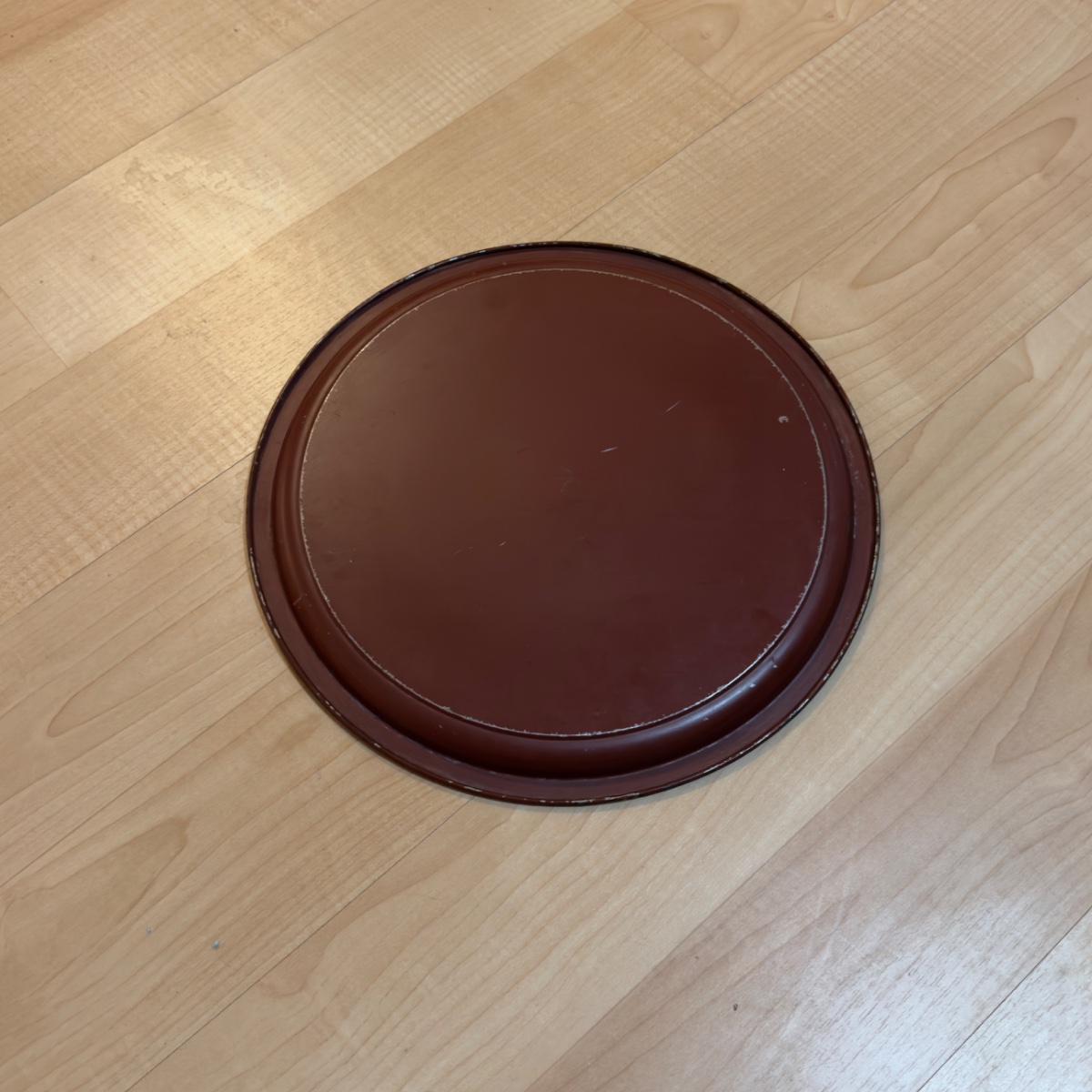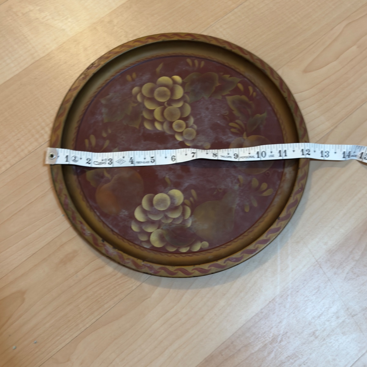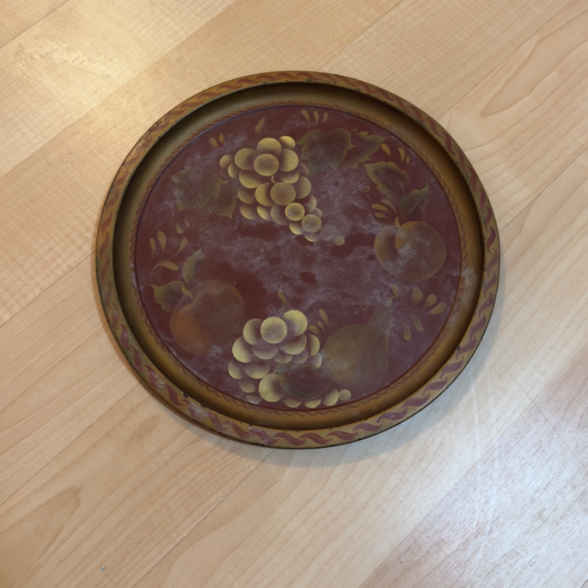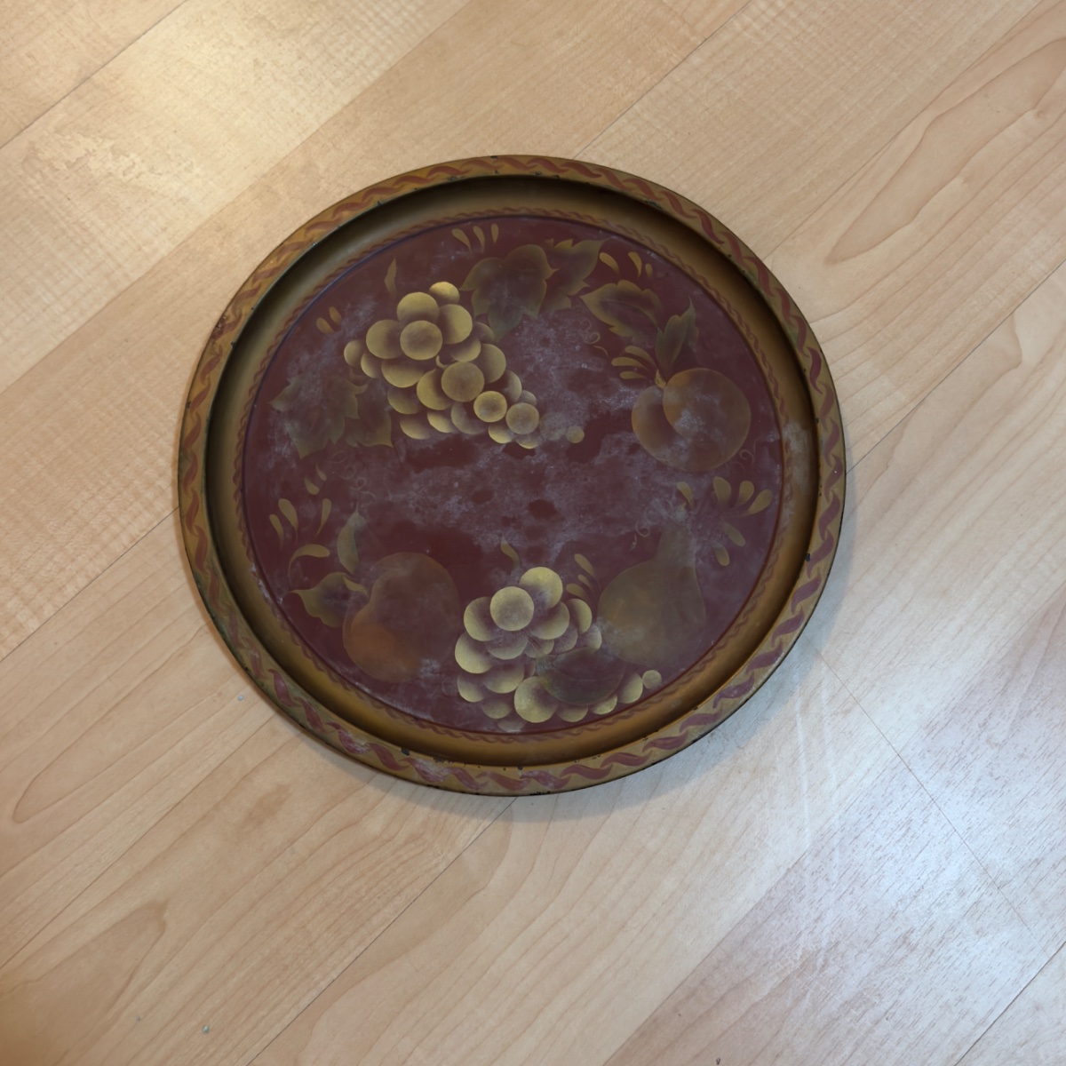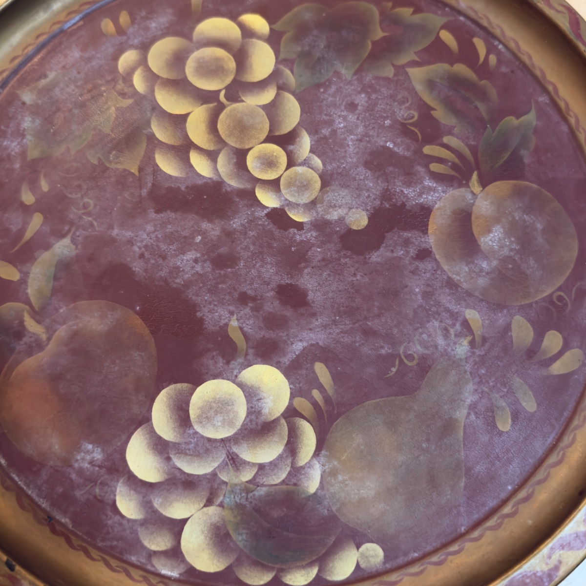 A classic example of American toleware, this circular metal tray features a hand-painted still life of grapes, pears, and apples against a rich oxblood background.