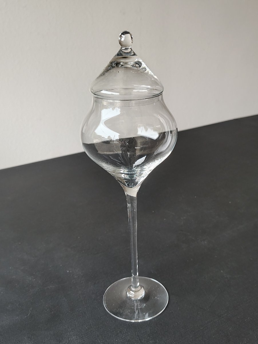 This is a 'bonbonniere' or decorative apothecary jar, characterized by its elegant, elongated stem and organic, bulbous bowl.