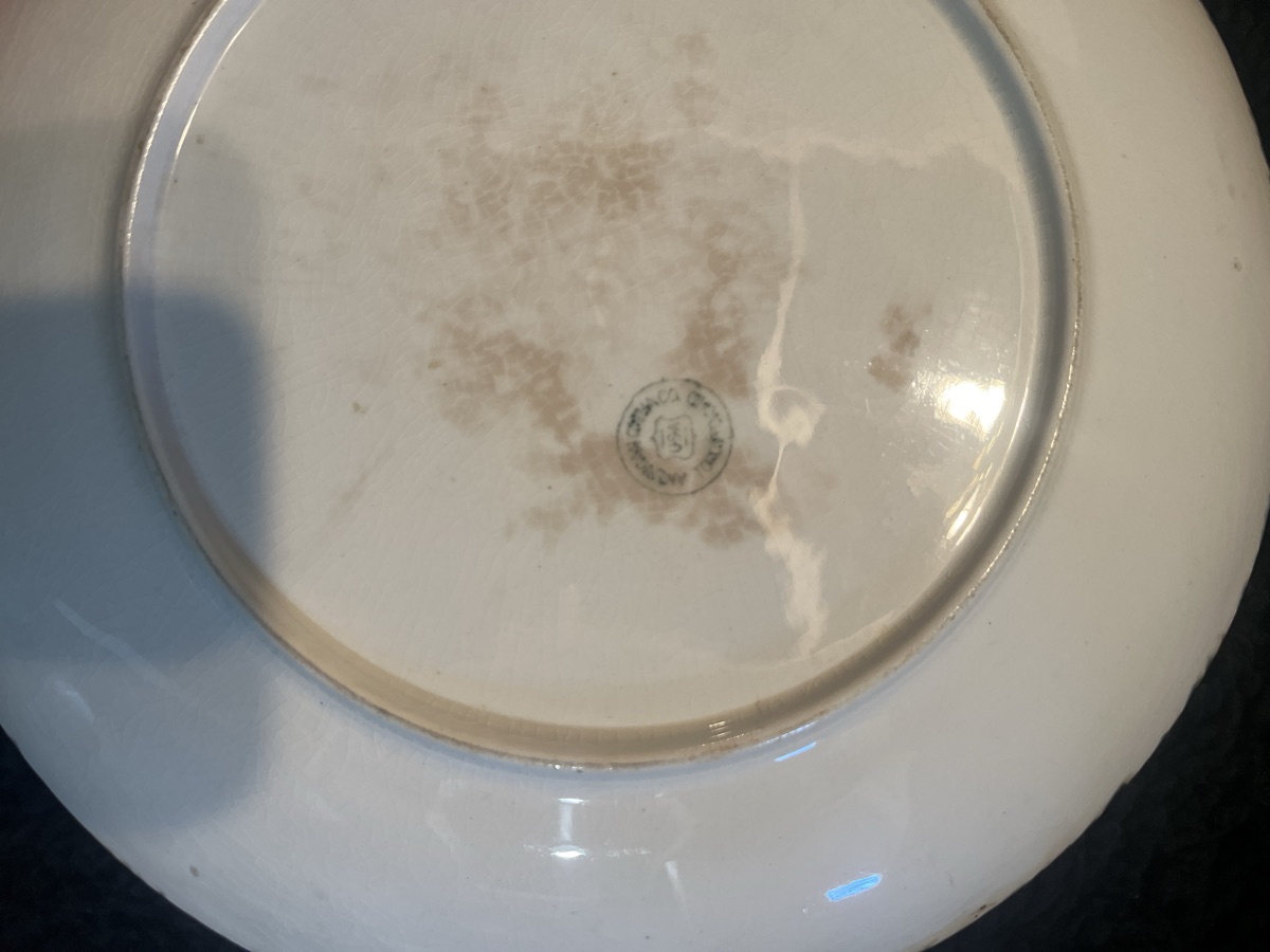 The front of the plate presents well, but the reverse shows heavy crazing and 'tea staining'—discoloration caused by moisture and oils seeping into the porous clay body… While these pieces are beloved by collectors of Americana and 'shabby chic' decor, they were mass-produced in high volumes.