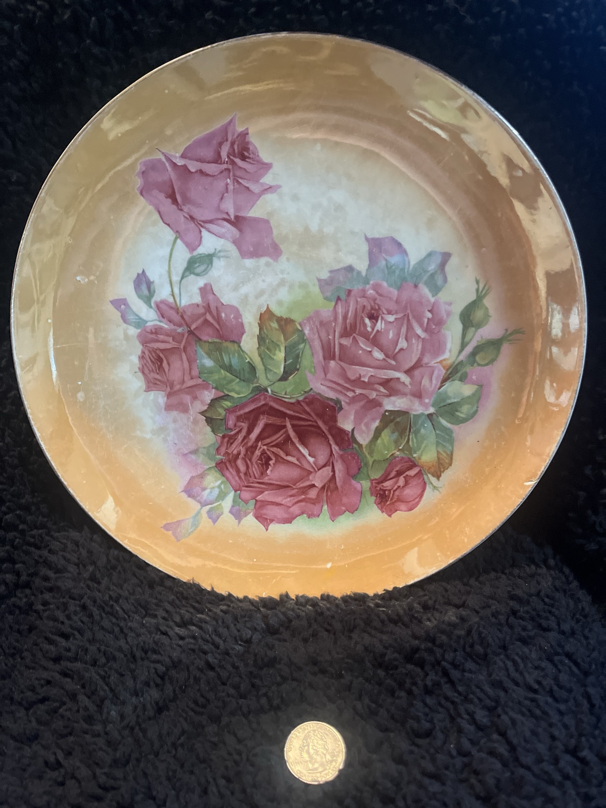 A charming example of American semi-vitreous dinnerware featuring a vibrant decal of cabbage roses framed by a shimmering peach-toned lustre border.