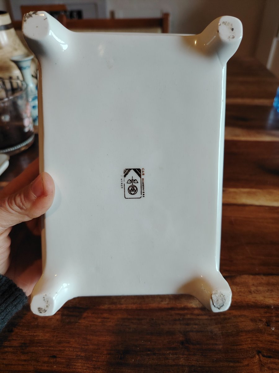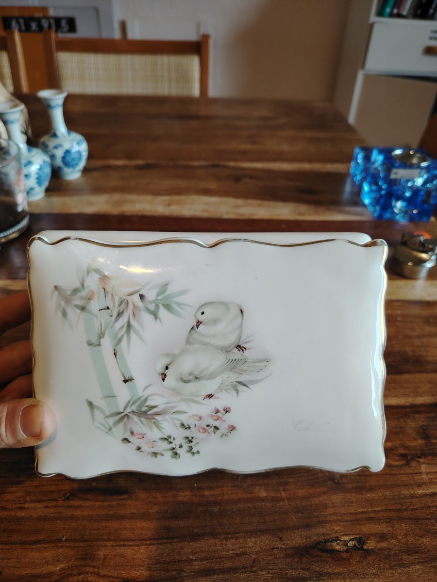 The porcelain appears bright and well-preserved. Values for mid-century Italian giftware are driven by the charm of the motif and the condition of the gold gilding.