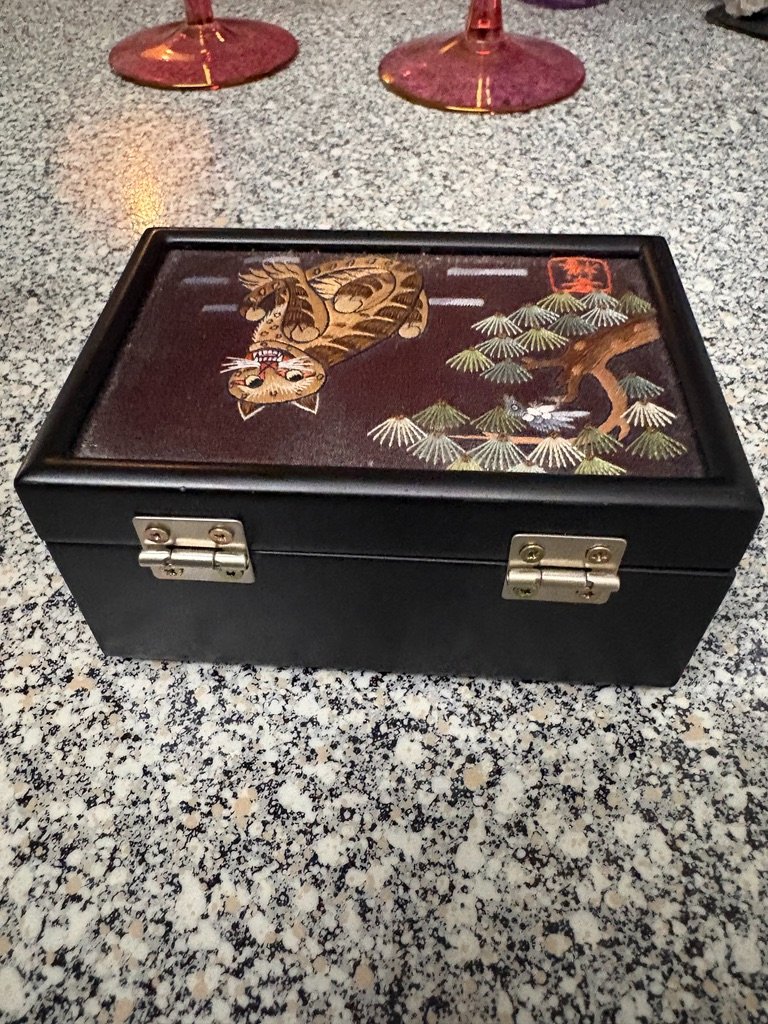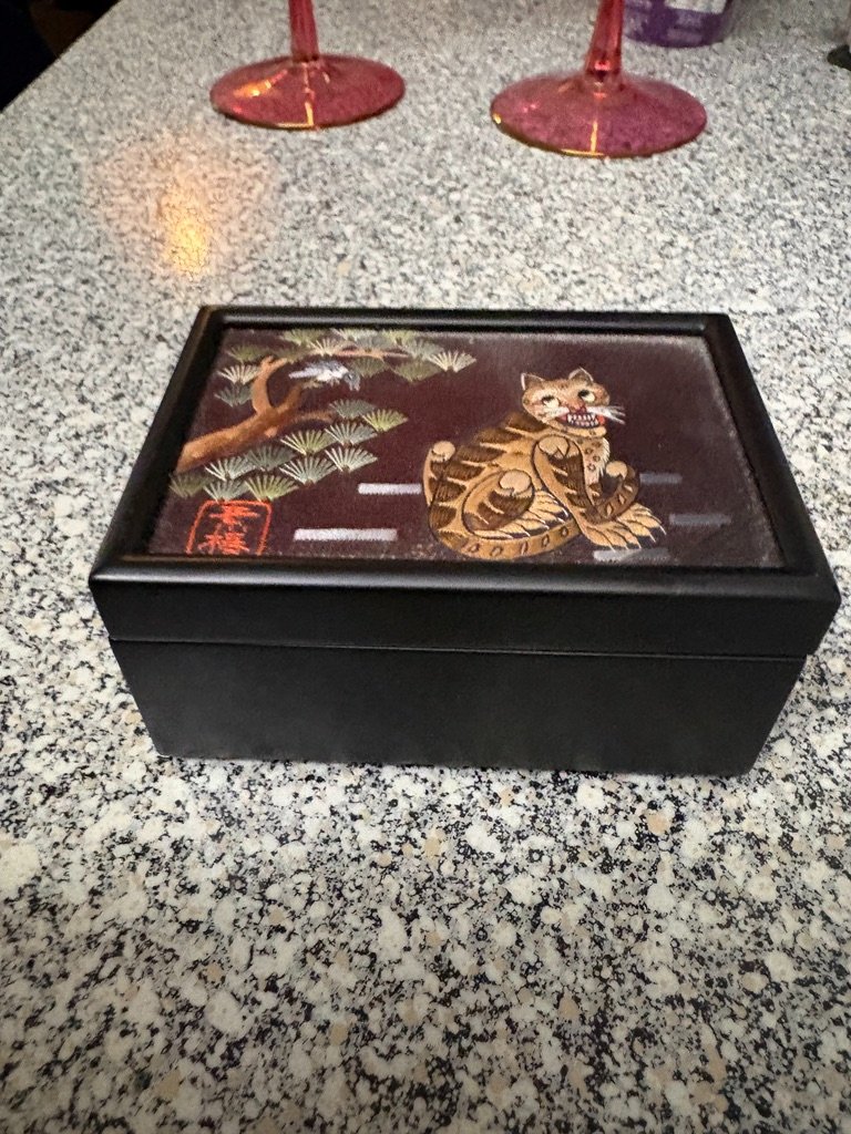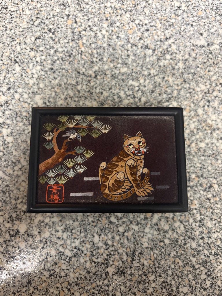 This charming box features a hand-embroidered silk panel depicting the 'Kkachihogangi,' a beloved Korean folk art theme of the tiger and the magpie.