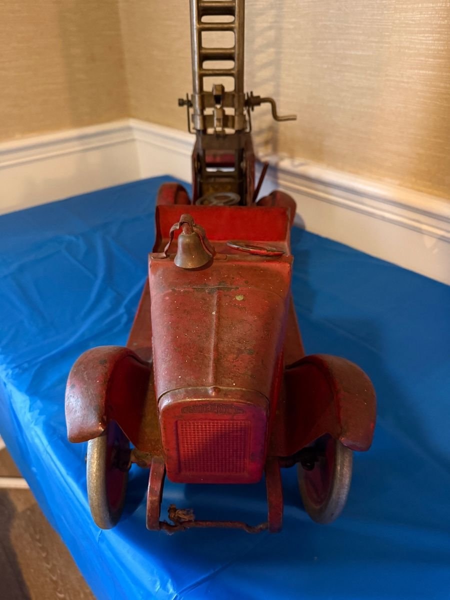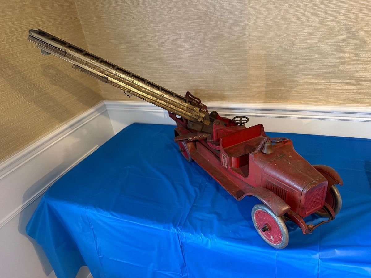The truck shows honest play wear including paint loss, surface rust, and some minor bending to the fenders. The ladder and crank mechanism appear functional and the original pull-string loop is still present on the front bumper.
