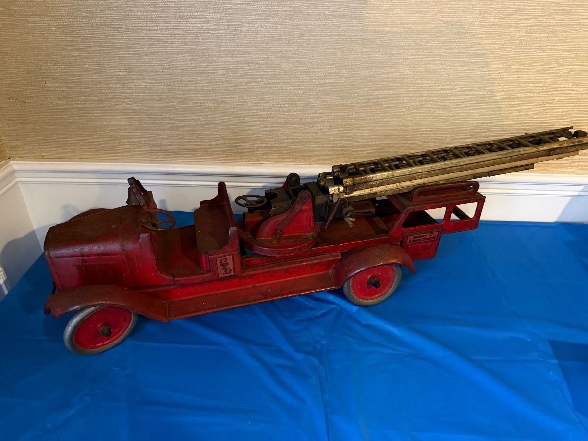 This is a monumental piece of American toy history, a heavy-gauge pressed steel fire truck designed to be virtually indestructible.