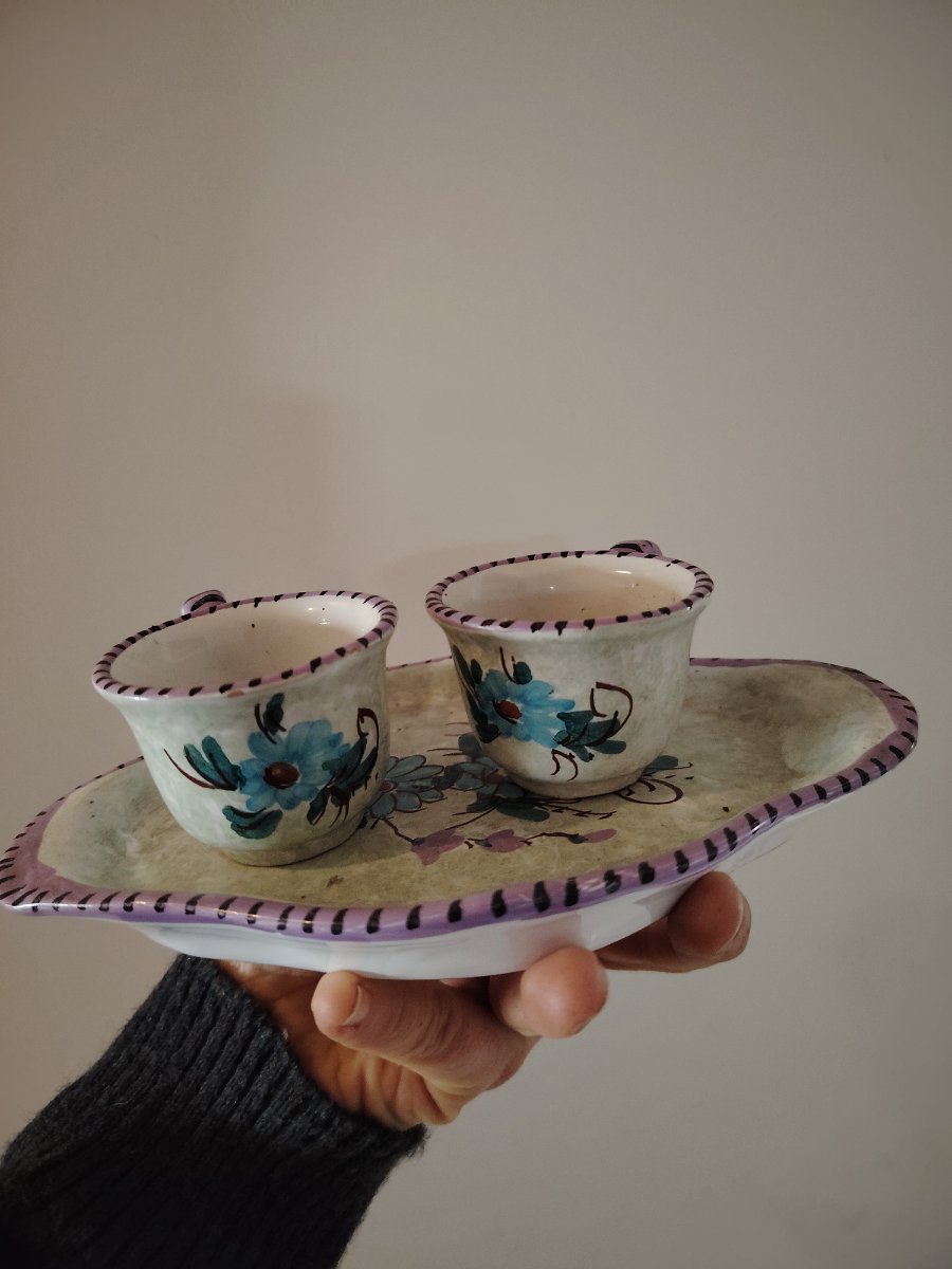 A charming three-piece hand-painted ceramic set featuring two espresso cups and a matching scalloped tray.
