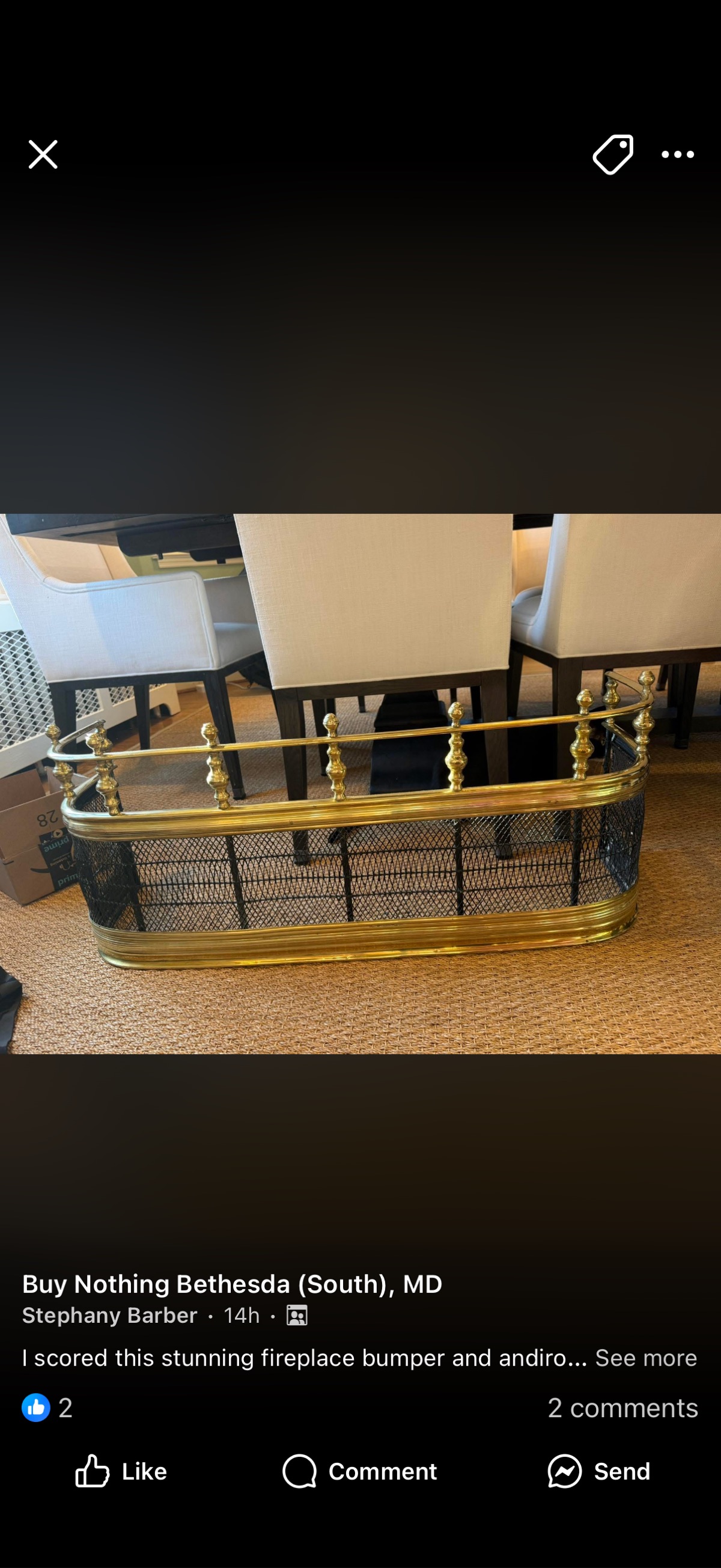 This is a classic brass fireplace fender, a piece of 'hearth furniture' designed to protect expensive rugs from stray embers while framing the fireplace with elegance.