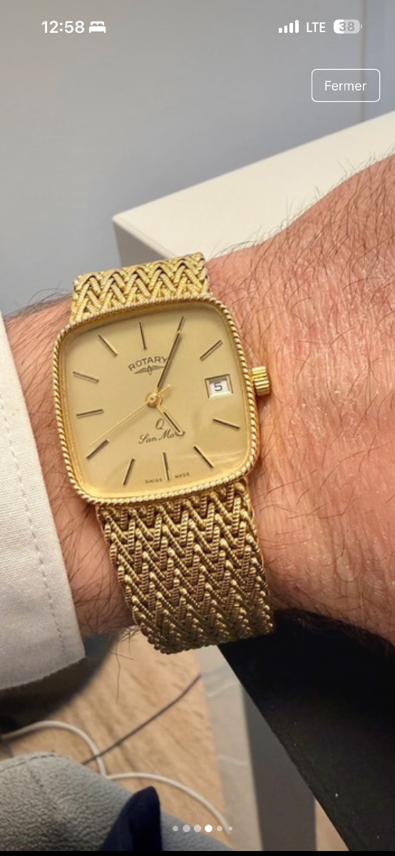 The gold plating appears remarkably well-preserved with very little 'brassing' or wear-through on the high-friction areas of the bracelet. Value is based on the brand's solid reputation and the current 'retro-chic' trend for integrated bracelets.