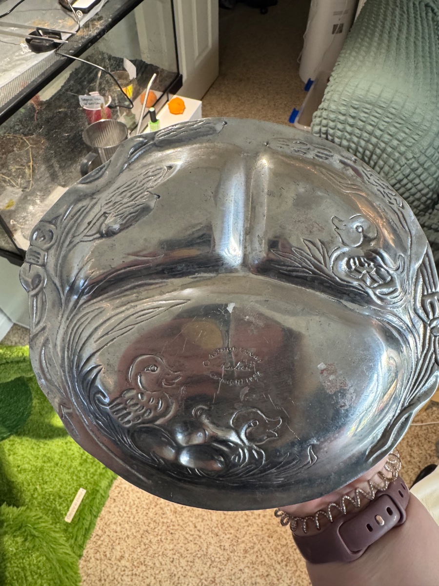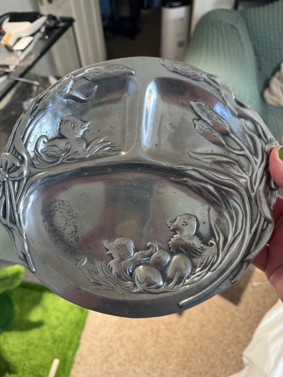 This is a charming sand-cast aluminum divided plate featuring a whimsical 'Duck and Duckling' motif, complete with cattails and eggs.