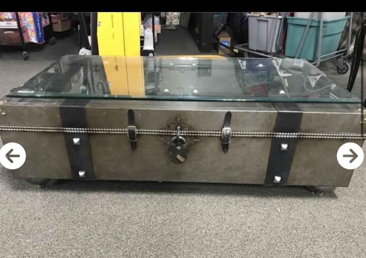 This is a contemporary coffee table designed to replicate the rugged elegance of early 20th-century transatlantic travel luggage.