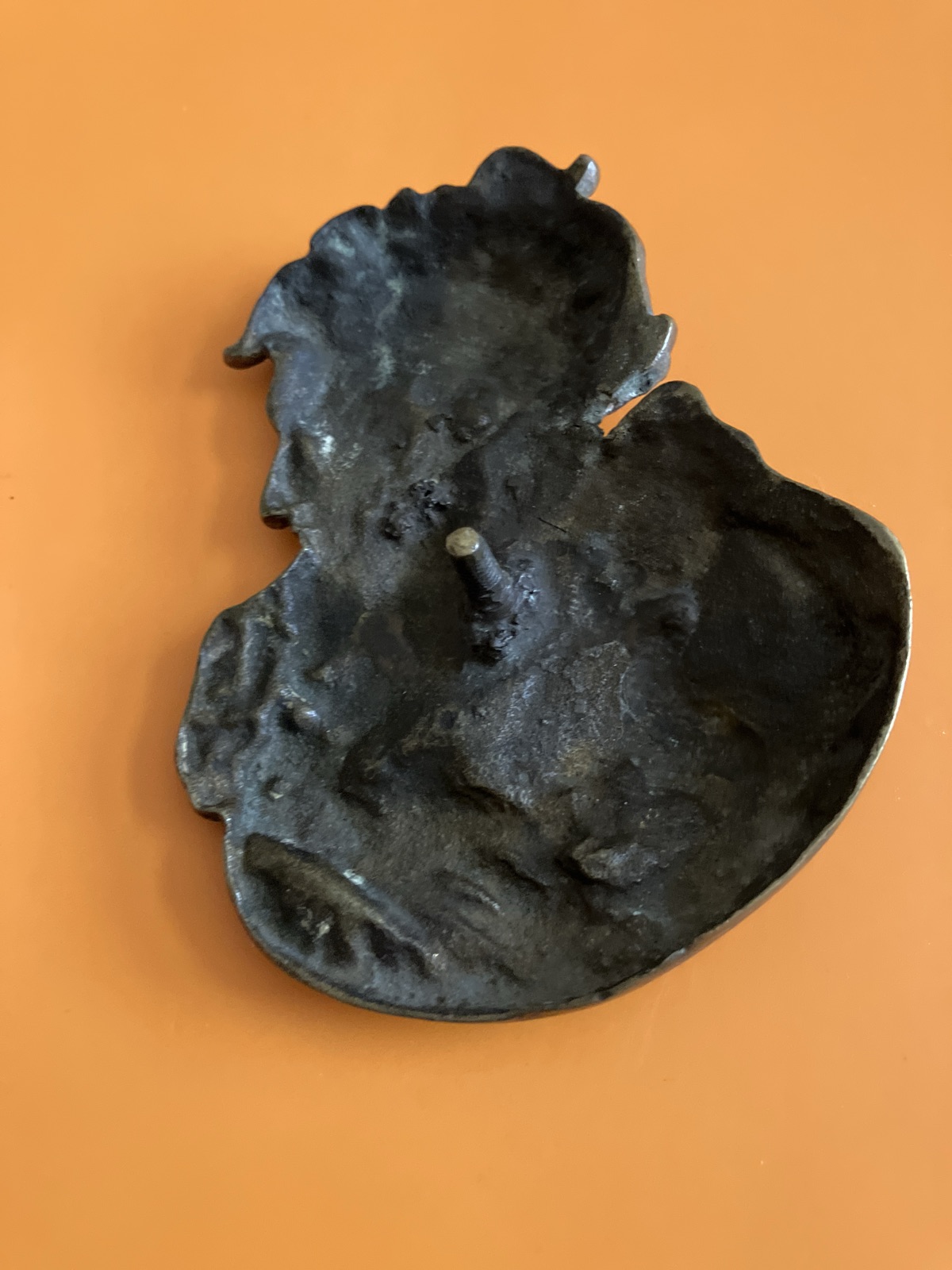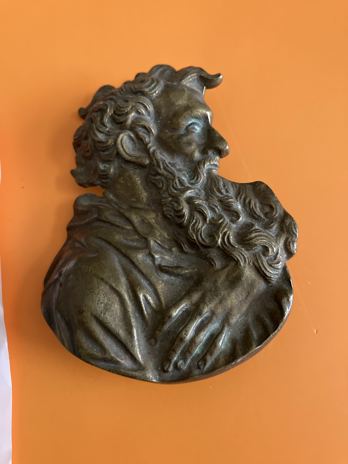 A high-relief cast bronze decorative mount depicting a classical bearded figure in a contemplative pose.