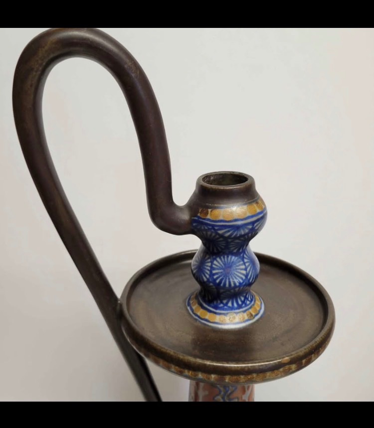 A striking pair of Dutch matte-glaze pottery candlesticks featuring the intricate 'Ajour' pattern and a unique high-arched handle design.