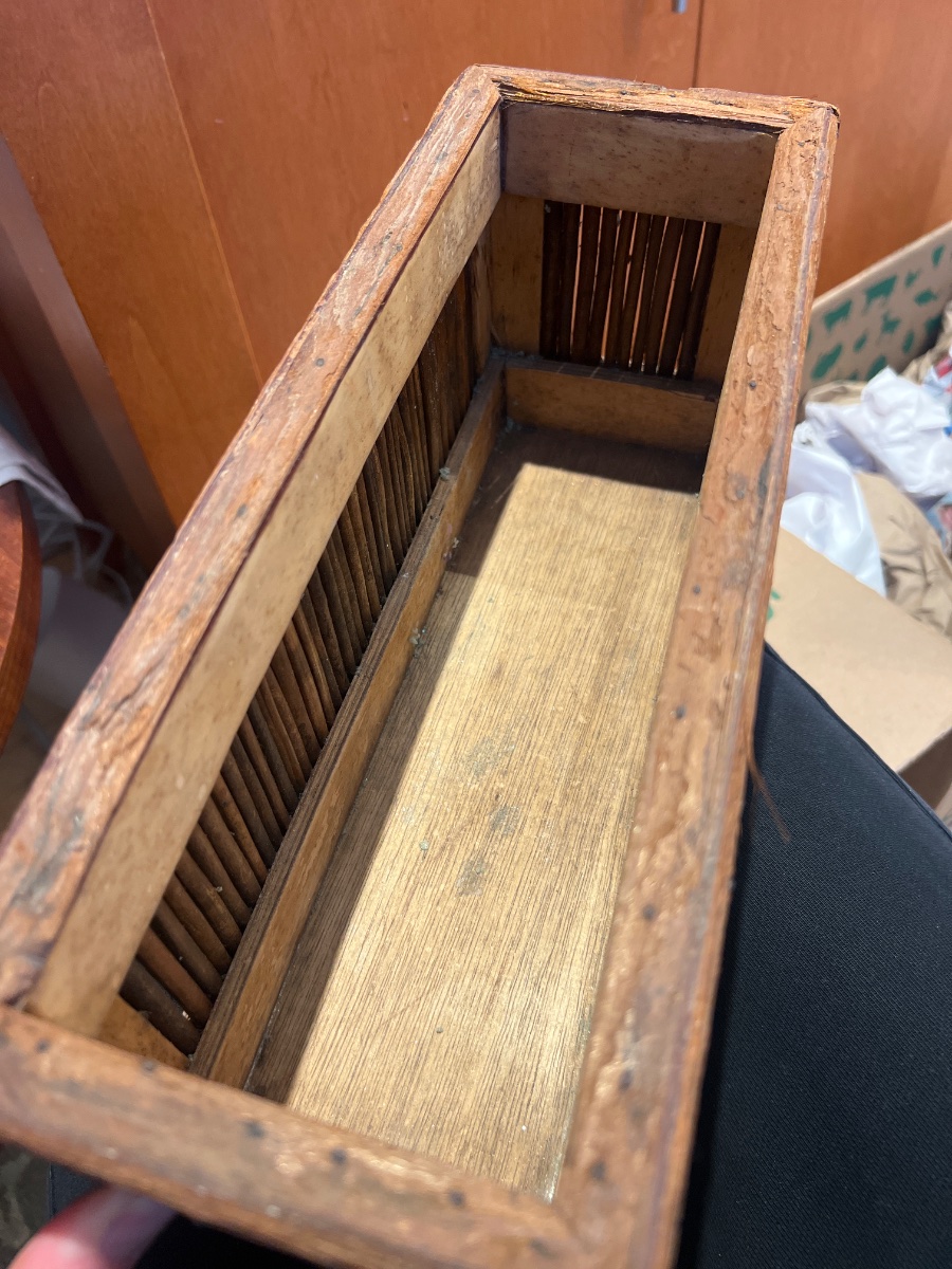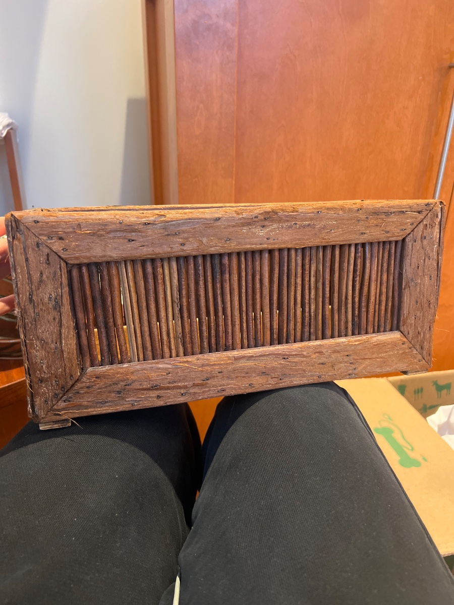 This is a charming example of American rustic folk art, specifically a small planter or decorative box crafted from natural twigs and bark-clad wood.