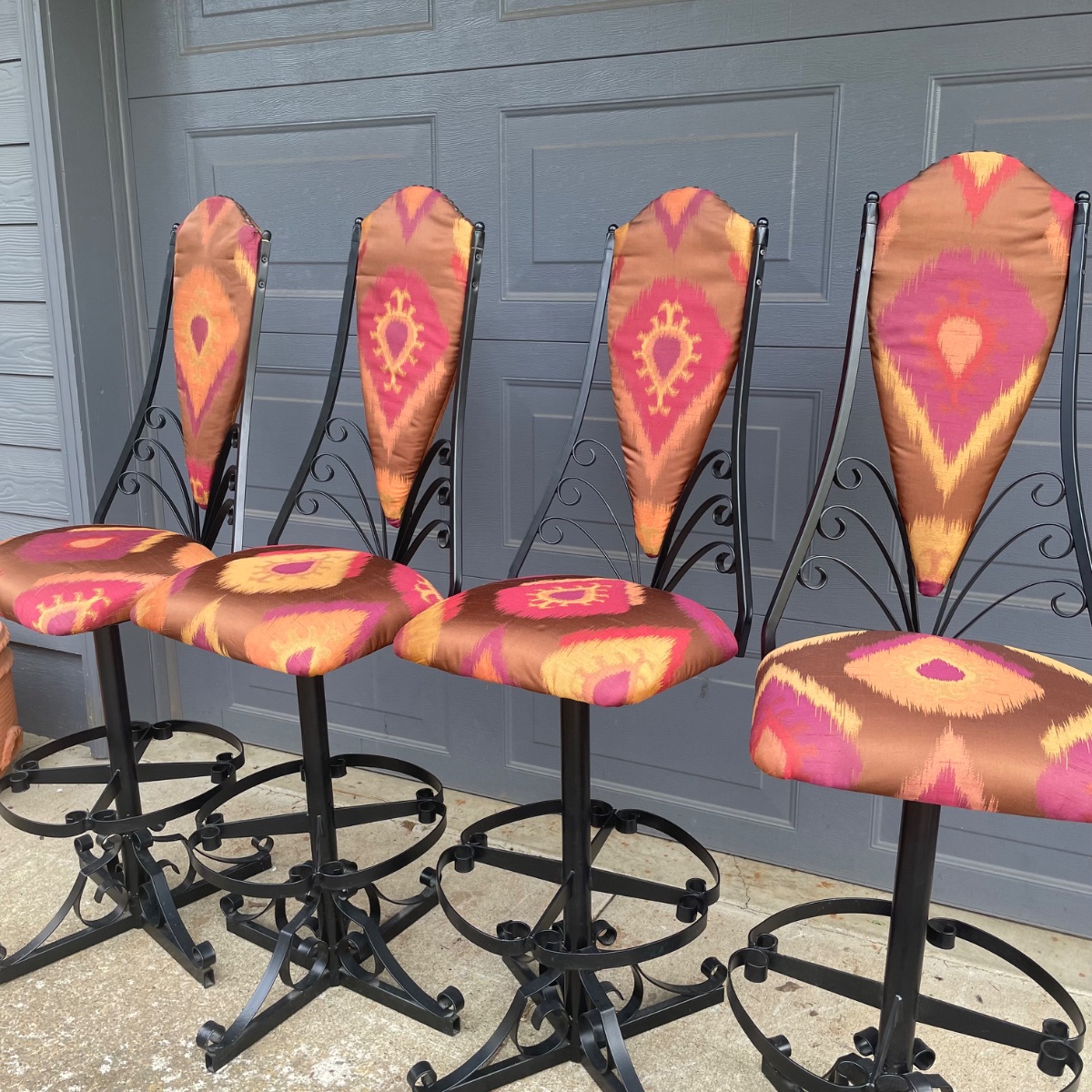 The iron frames appear to be in excellent structural condition with no visible rust or failed welds. Sets of four are significantly more valuable than pairs or singles.