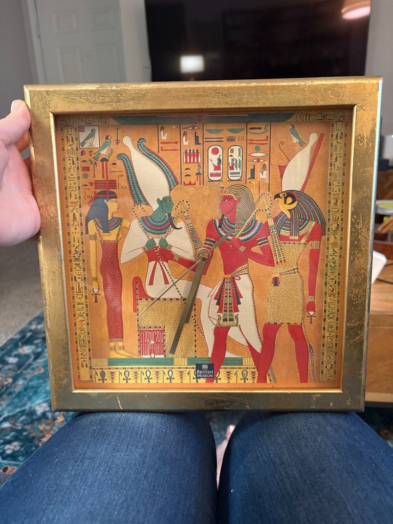 A square quartz wall clock featuring a high-fidelity reproduction of an Ancient Egyptian funerary scene, likely from the Papyrus of Hunefer or Ani.
