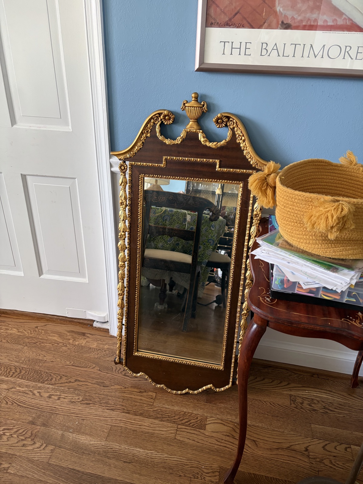 The mirror appears to be in excellent vintage condition with the delicate side swags remarkably intact. High-quality 20th-century reproductions by noted makers hold steady value.